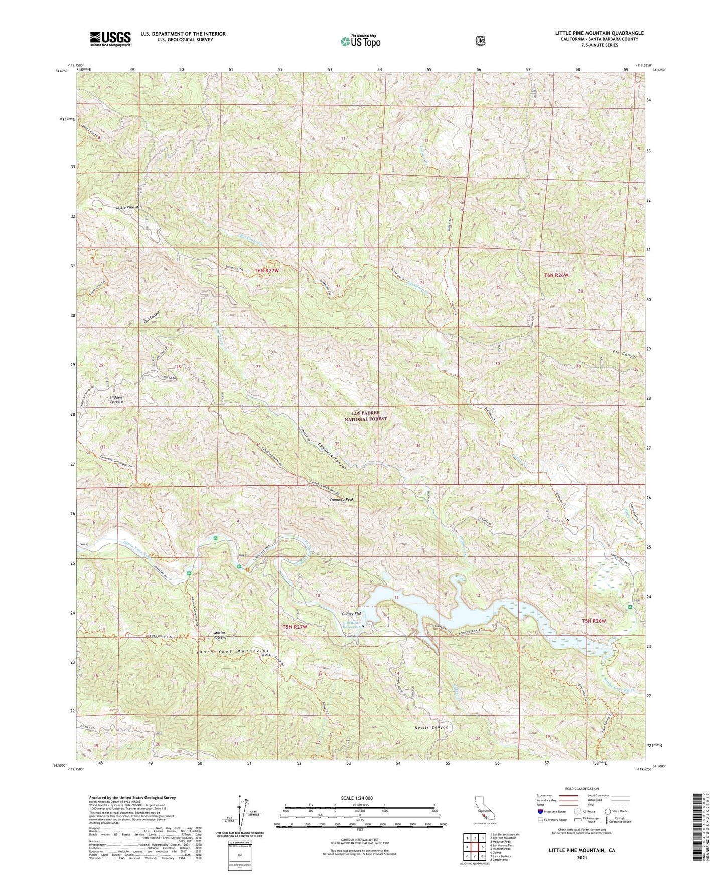 2021 topographic map quadrangle Little Pine Mountain in the state of California. Scale: 1:24000. Based on the newly updated USGS 7.5' US Topo map series, this map is in the following counties: Santa Barbara. The map contains contour data, water features, and other items you are used to seeing on USGS maps, but also has updated roads and other features. This is the next generation of topographic maps. Printed on high-quality waterproof paper with UV fade-resistant inks.