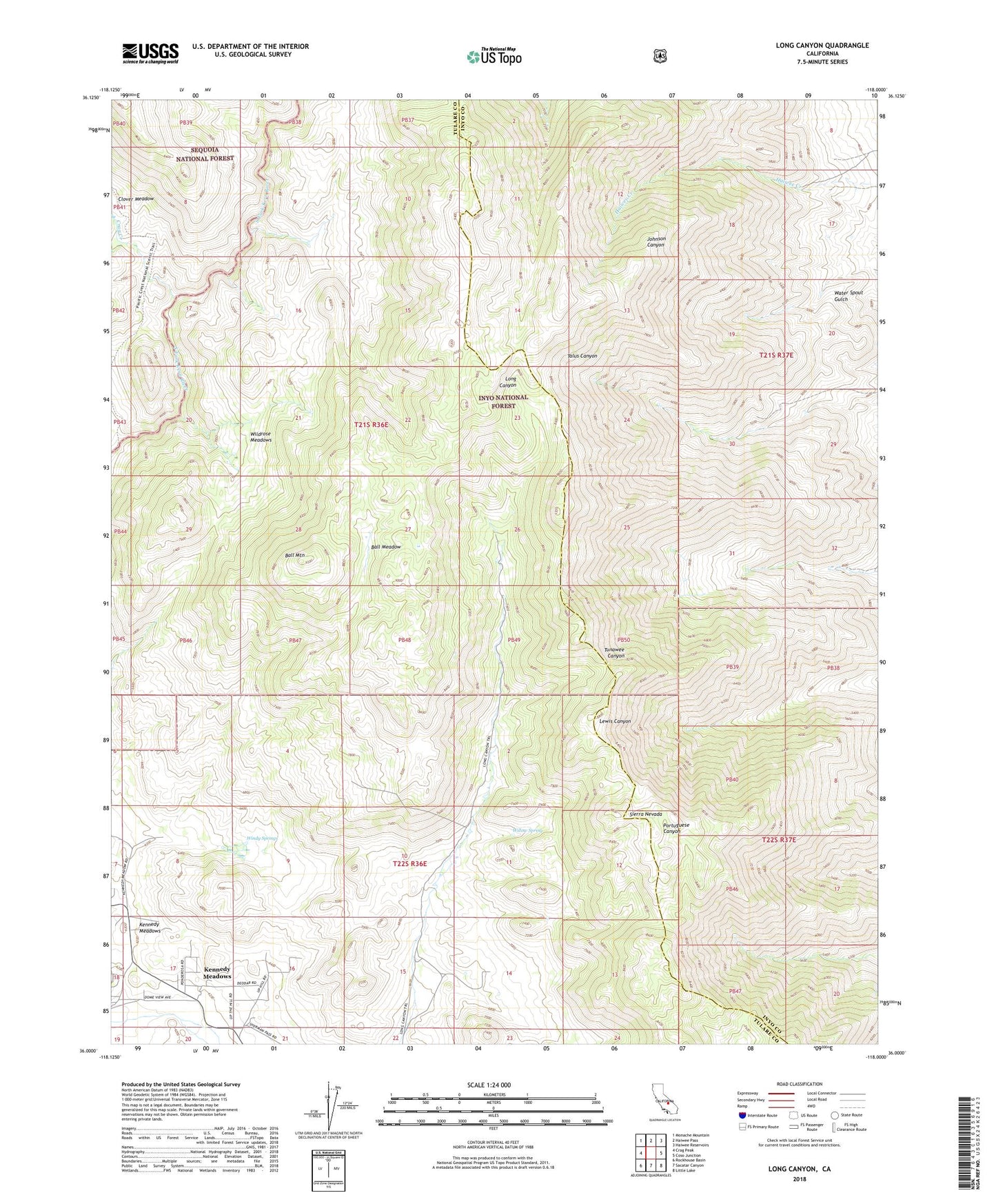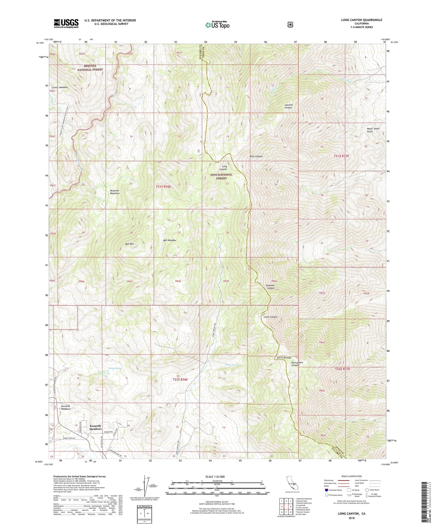 2021 topographic map quadrangle Long Canyon in the state of California. Scale: 1:24000. Based on the newly updated USGS 7.5' US Topo map series, this map is in the following counties: Tulare, Inyo. The map contains contour data, water features, and other items you are used to seeing on USGS maps, but also has updated roads and other features. This is the next generation of topographic maps. Printed on high-quality waterproof paper with UV fade-resistant inks.