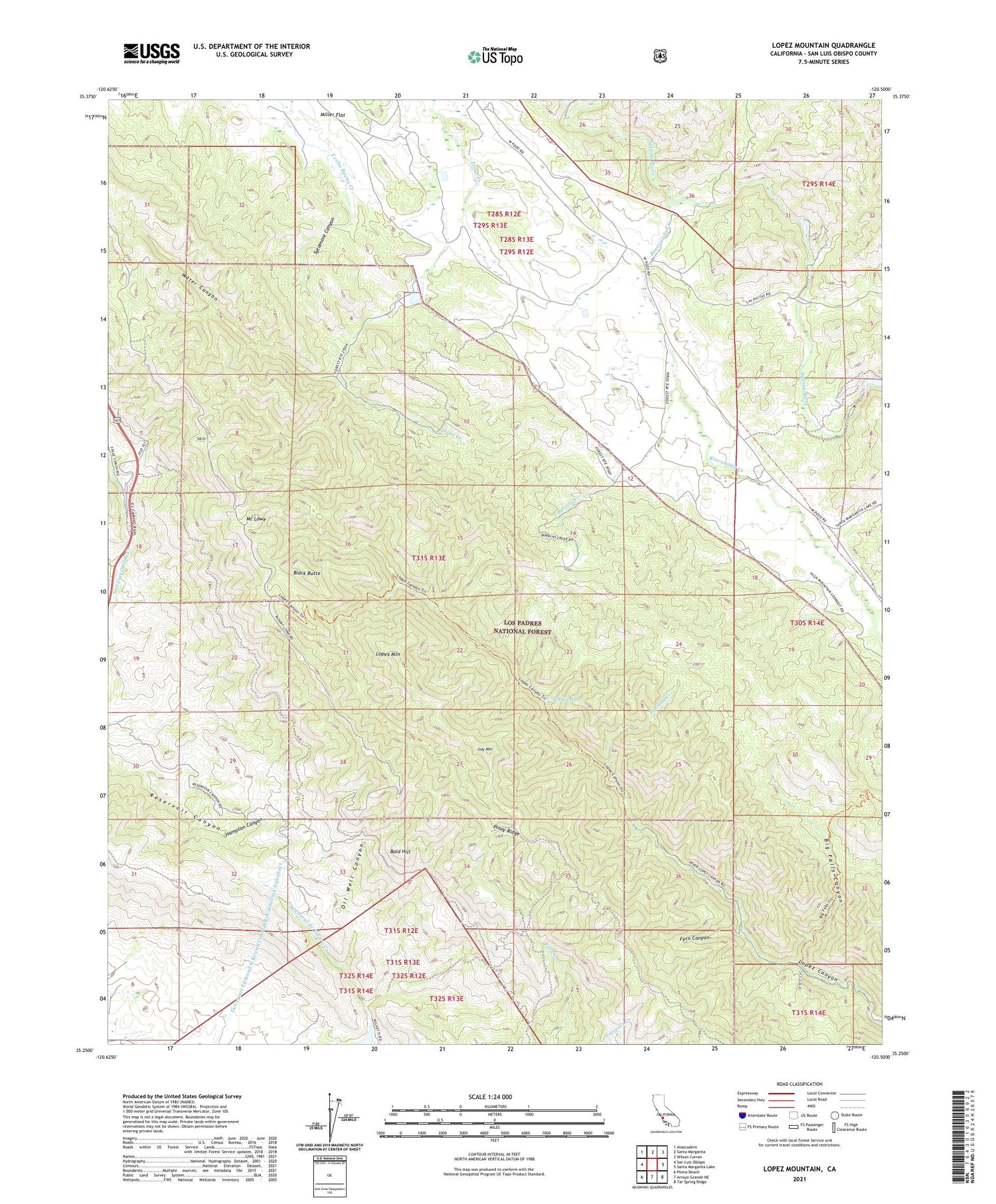 2021 topographic map quadrangle Lopez Mountain in the state of California. Scale: 1:24000. Based on the newly updated USGS 7.5' US Topo map series, this map is in the following counties: San Luis Obispo. The map contains contour data, water features, and other items you are used to seeing on USGS maps, but also has updated roads and other features. This is the next generation of topographic maps. Printed on high-quality waterproof paper with UV fade-resistant inks.