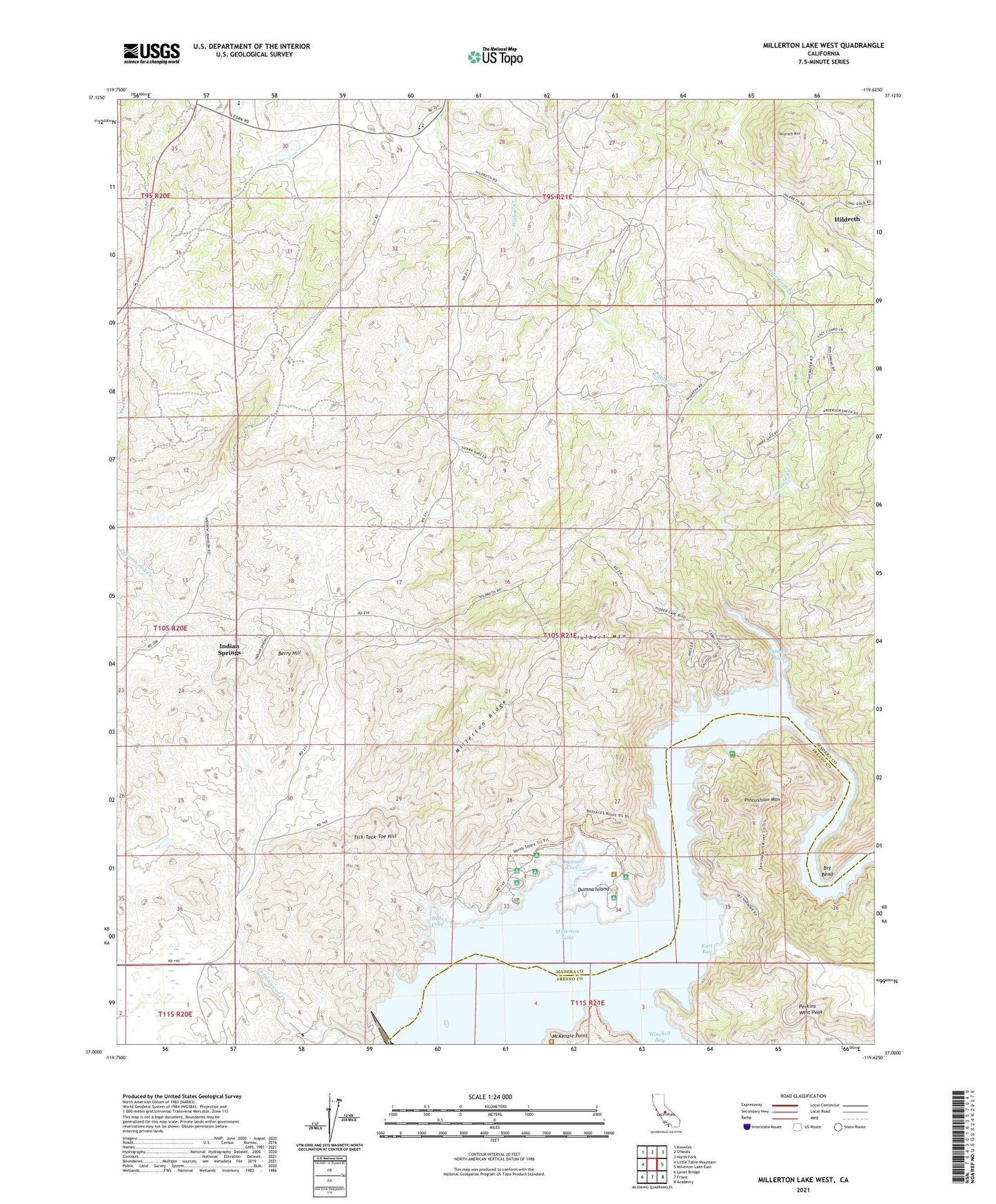 2021 topographic map quadrangle Millerton Lake West in the state of California. Scale: 1:24000. Based on the newly updated USGS 7.5' US Topo map series, this map is in the following counties: Madera, Fresno. The map contains contour data, water features, and other items you are used to seeing on USGS maps, but also has updated roads and other features. This is the next generation of topographic maps. Printed on high-quality waterproof paper with UV fade-resistant inks.