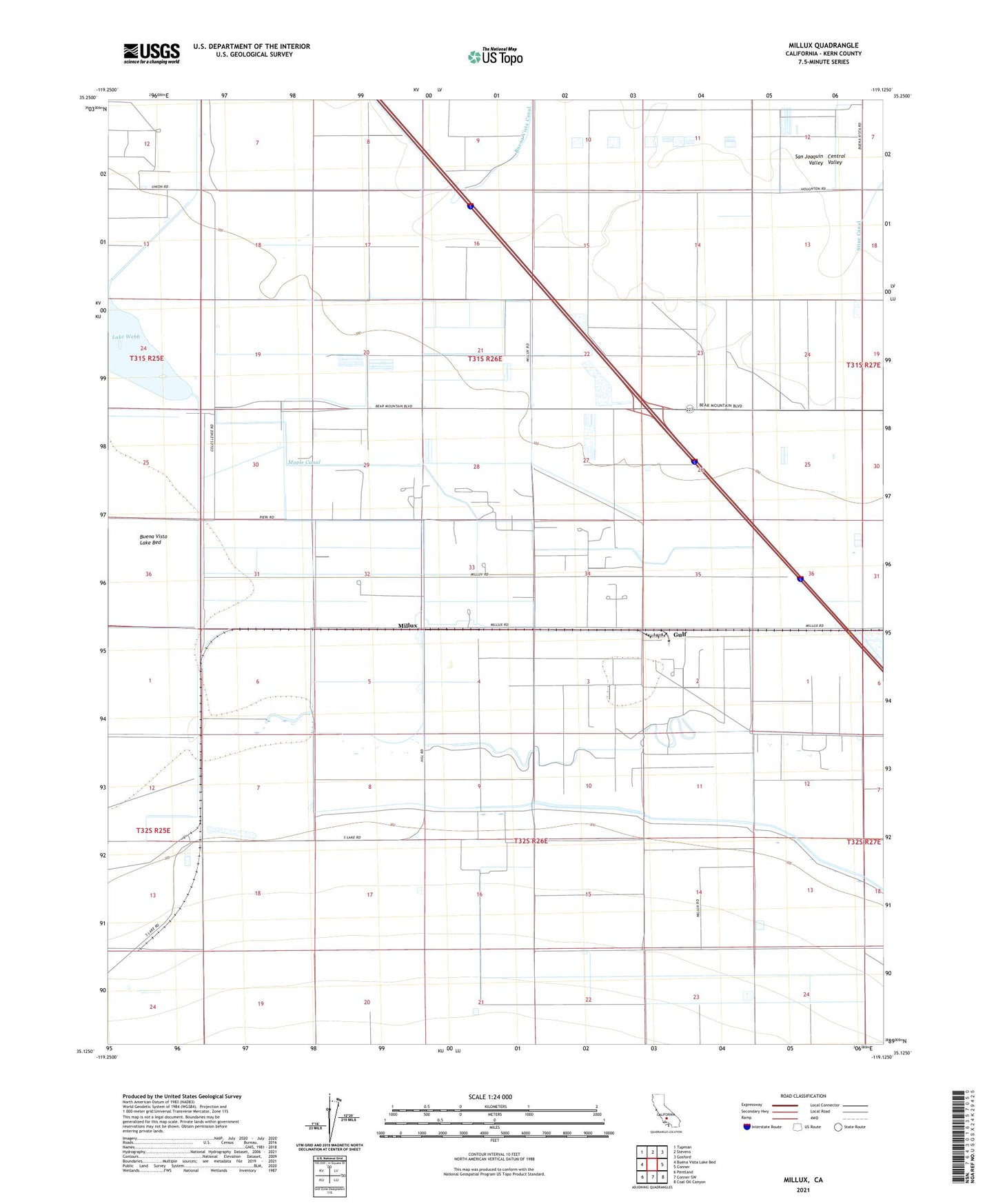 2021 topographic map quadrangle Millux in the state of California. Scale: 1:24000. Based on the newly updated USGS 7.5' US Topo map series, this map is in the following counties: Kern. The map contains contour data, water features, and other items you are used to seeing on USGS maps, but also has updated roads and other features. This is the next generation of topographic maps. Printed on high-quality waterproof paper with UV fade-resistant inks.