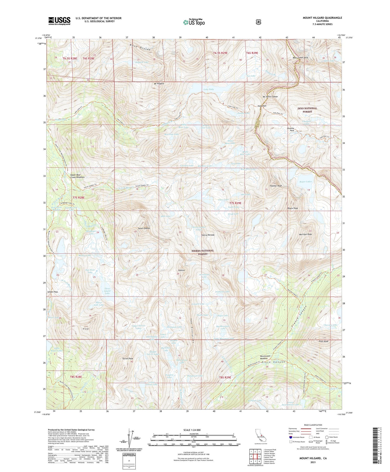 2023 topographic map quadrangle Mount Hilgard in the state of California. Scale: 1:24000. Based on the newly updated USGS 7.5' US Topo map series, this map is in the following counties: Fresno, Inyo. The map contains contour data, water features, and other items you are used to seeing on USGS maps, but also has updated roads and other features. This is the next generation of topographic maps. Printed on high-quality waterproof paper with UV fade-resistant inks.