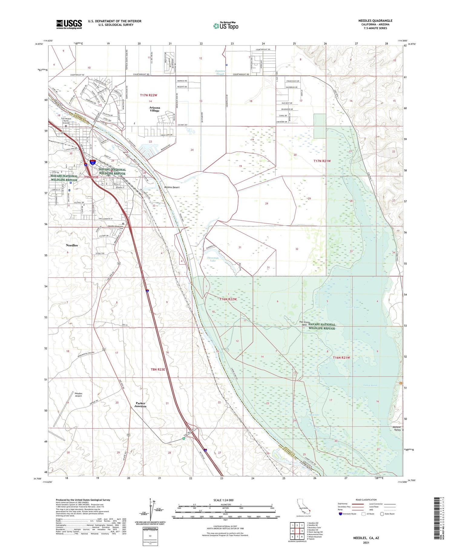 2021 topographic map quadrangle Needles in the states of Arizona, California. Scale: 1:24000. Based on the newly updated USGS 7.5' US Topo map series, this map is in the following counties: San Bernardino, Mohave. The map contains contour data, water features, and other items you are used to seeing on USGS maps, but also has updated roads and other features. This is the next generation of topographic maps. Printed on high-quality waterproof paper with UV fade-resistant inks.