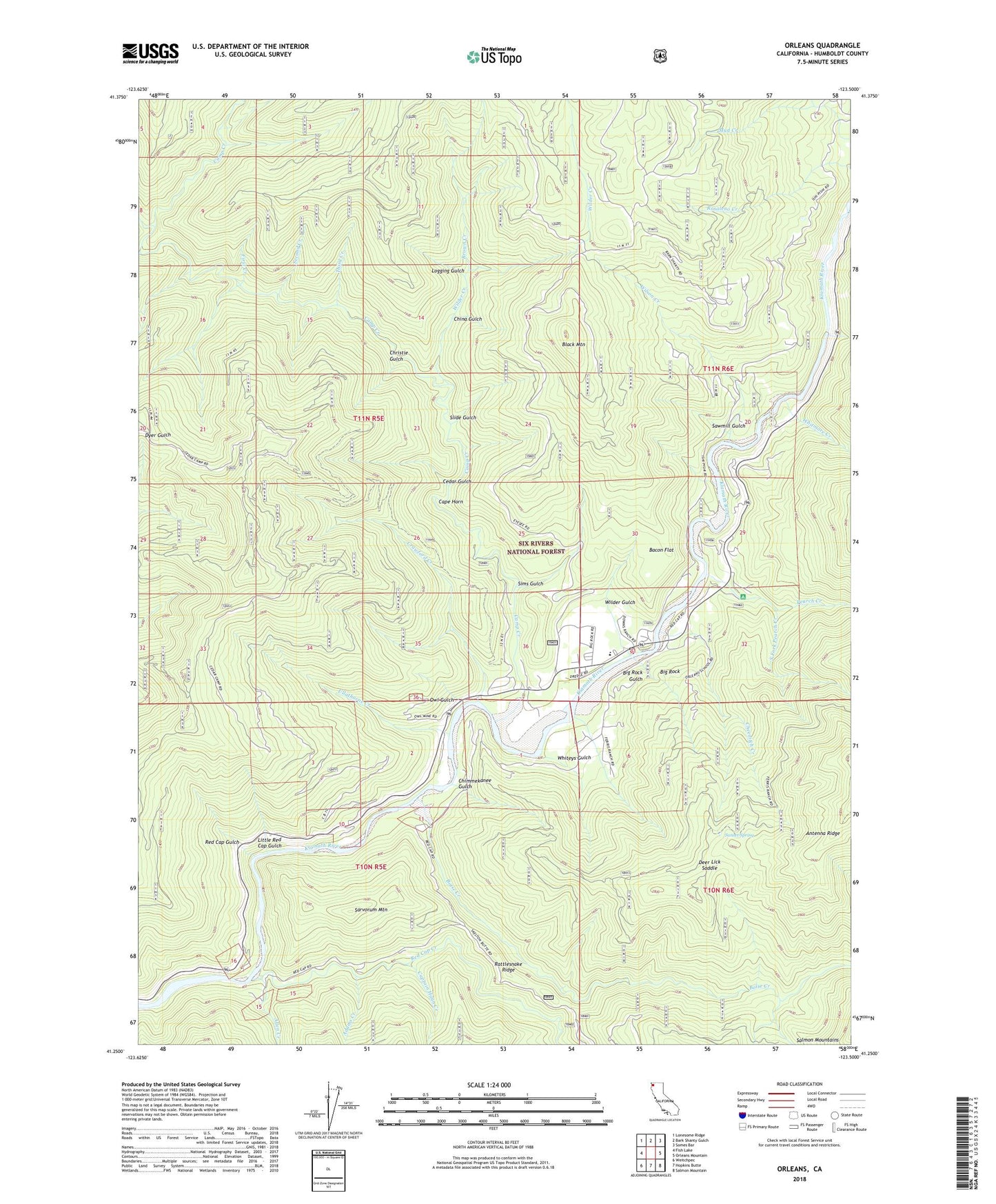 2022 topographic map quadrangle Orleans in the state of California. Scale: 1:24000. Based on the newly updated USGS 7.5' US Topo map series, this map is in the following counties: Humboldt. The map contains contour data, water features, and other items you are used to seeing on USGS maps, but also has updated roads and other features. This is the next generation of topographic maps. Printed on high-quality waterproof paper with UV fade-resistant inks.