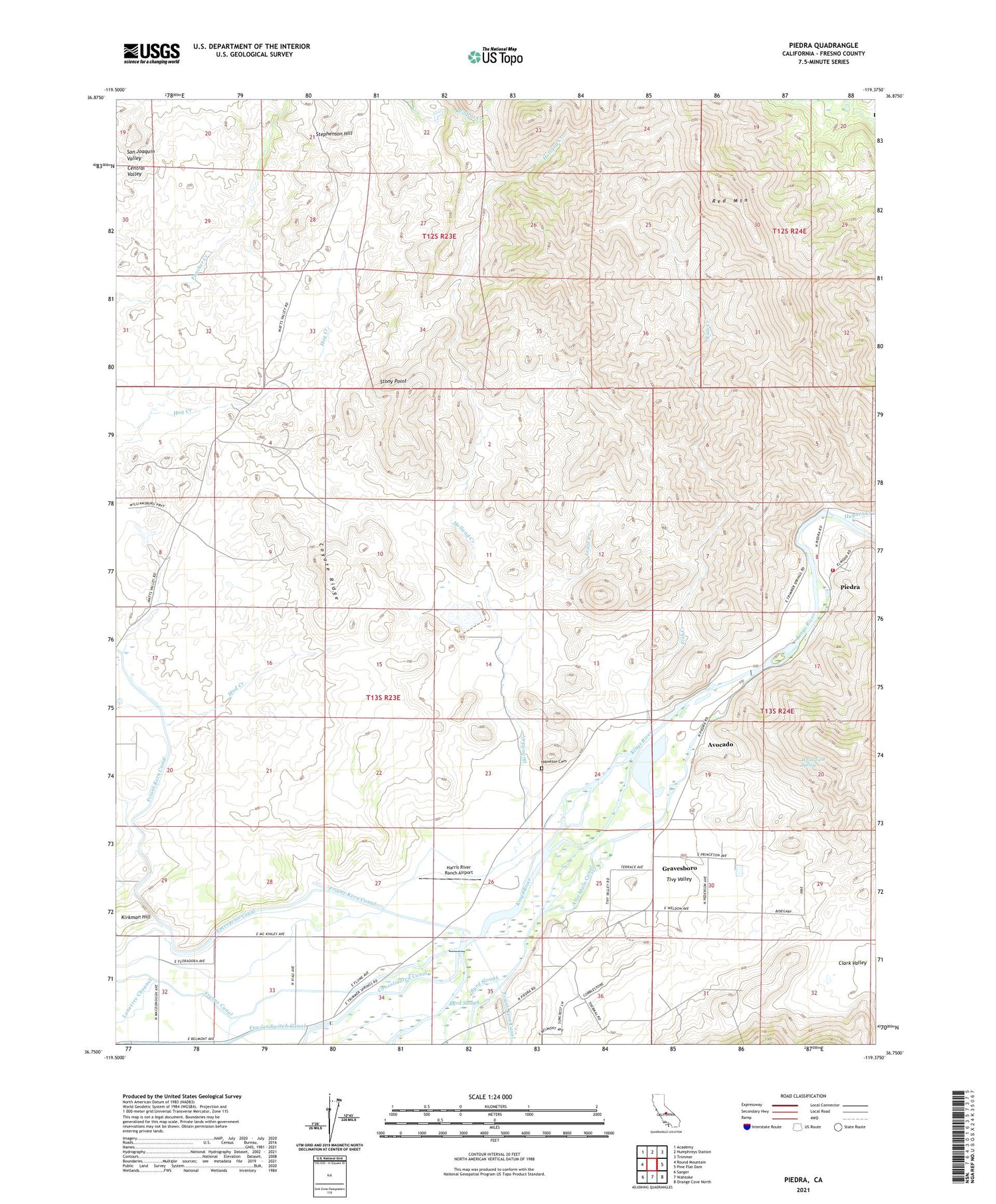 2021 topographic map quadrangle Piedra in the state of California. Scale: 1:24000. Based on the newly updated USGS 7.5' US Topo map series, this map is in the following counties: Fresno. The map contains contour data, water features, and other items you are used to seeing on USGS maps, but also has updated roads and other features. This is the next generation of topographic maps. Printed on high-quality waterproof paper with UV fade-resistant inks.