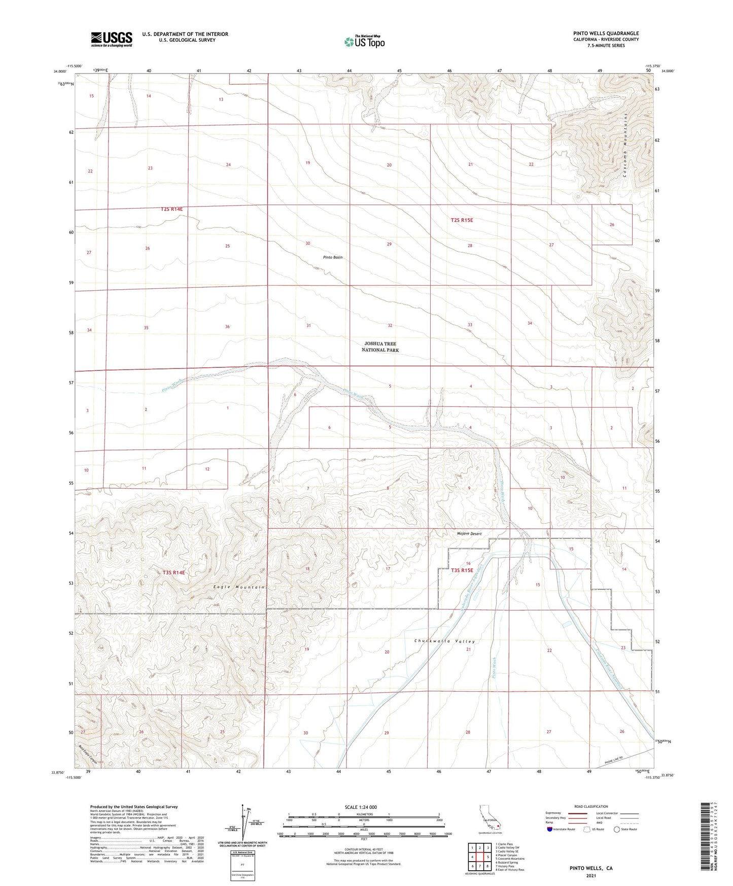 2021 topographic map quadrangle Pinto Wells in the state of California. Scale: 1:24000. Based on the newly updated USGS 7.5' US Topo map series, this map is in the following counties: Riverside. The map contains contour data, water features, and other items you are used to seeing on USGS maps, but also has updated roads and other features. This is the next generation of topographic maps. Printed on high-quality waterproof paper with UV fade-resistant inks.