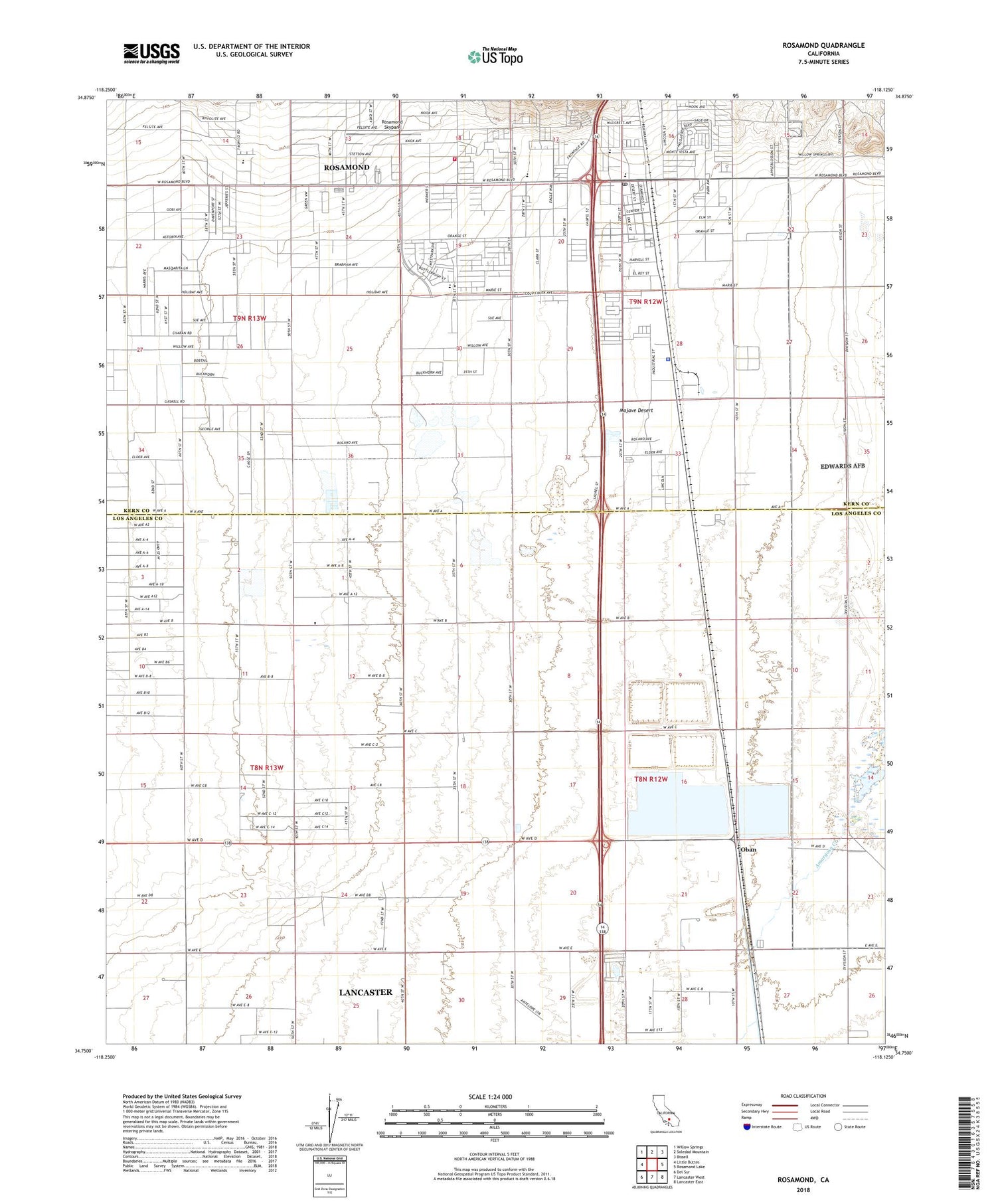 2022 topographic map quadrangle Rosamond in the state of California. Scale: 1:24000. Based on the newly updated USGS 7.5' US Topo map series, this map is in the following counties: Los Angeles, Kern. The map contains contour data, water features, and other items you are used to seeing on USGS maps, but also has updated roads and other features. This is the next generation of topographic maps. Printed on high-quality waterproof paper with UV fade-resistant inks.