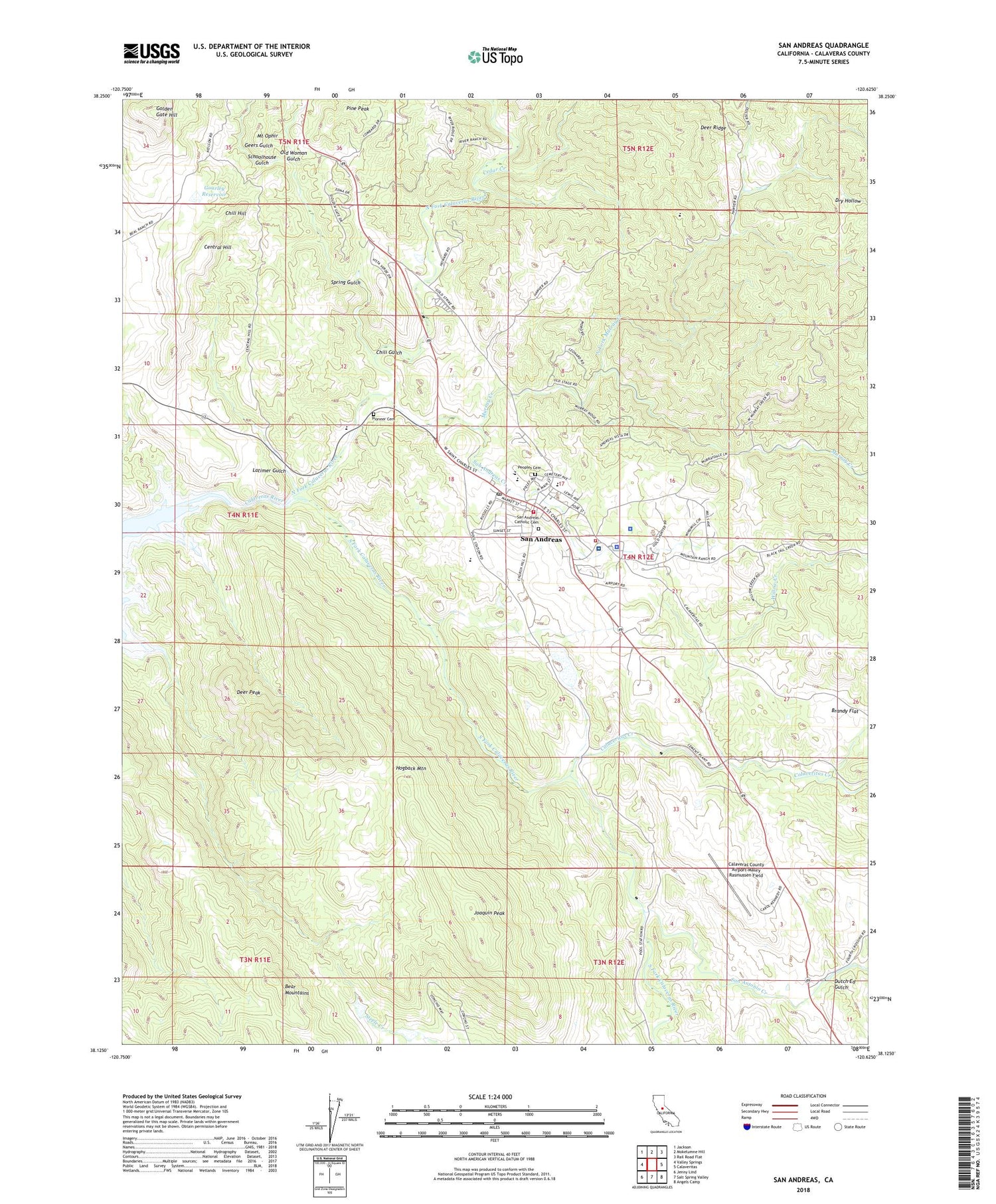 2021 topographic map quadrangle San Andreas in the state of California. Scale: 1:24000. Based on the newly updated USGS 7.5' US Topo map series, this map is in the following counties: Calaveras. The map contains contour data, water features, and other items you are used to seeing on USGS maps, but also has updated roads and other features. This is the next generation of topographic maps. Printed on high-quality waterproof paper with UV fade-resistant inks.