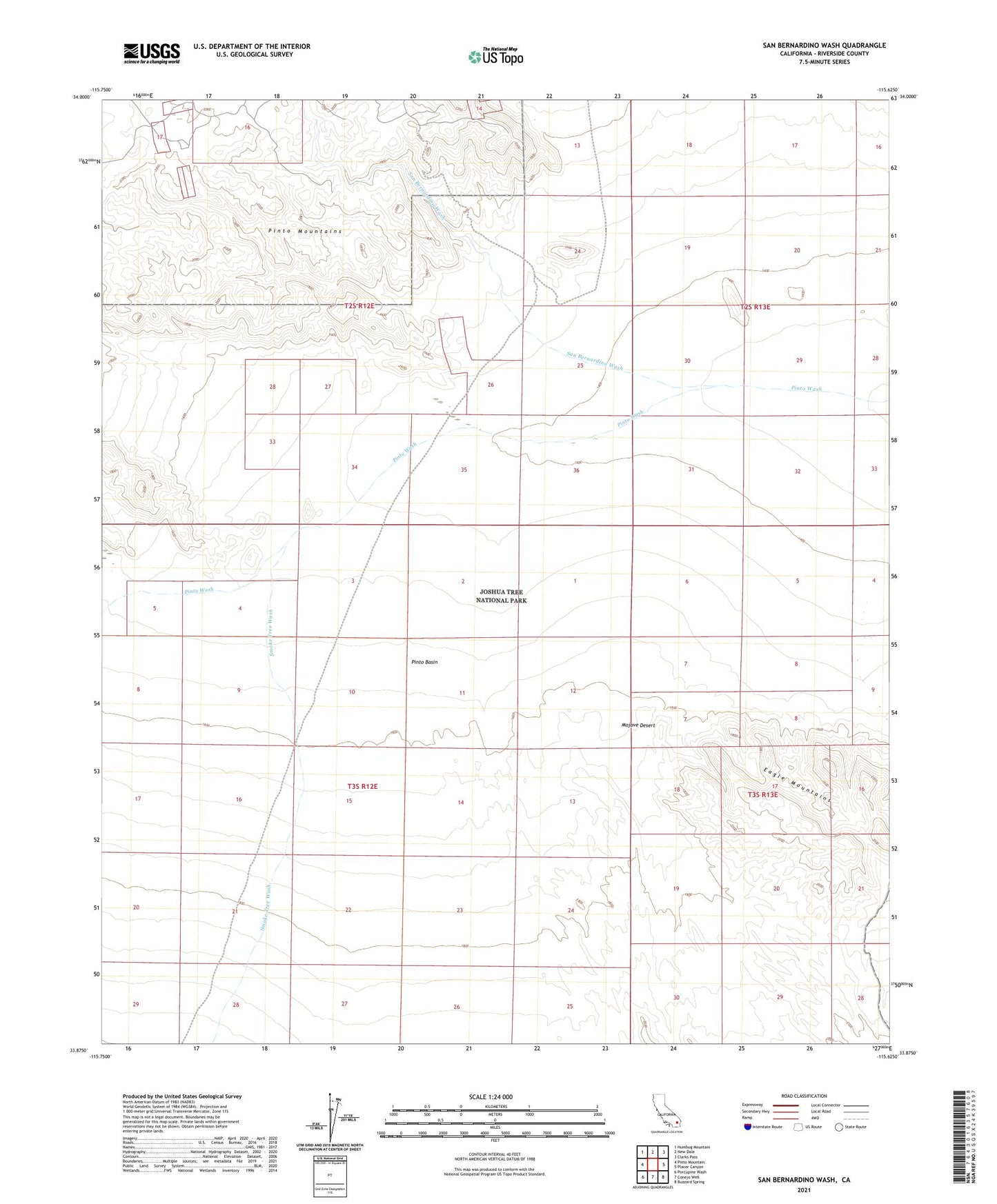 2021 topographic map quadrangle San Bernardino Wash in the state of California. Scale: 1:24000. Based on the newly updated USGS 7.5' US Topo map series, this map is in the following counties: Riverside. The map contains contour data, water features, and other items you are used to seeing on USGS maps, but also has updated roads and other features. This is the next generation of topographic maps. Printed on high-quality waterproof paper with UV fade-resistant inks.