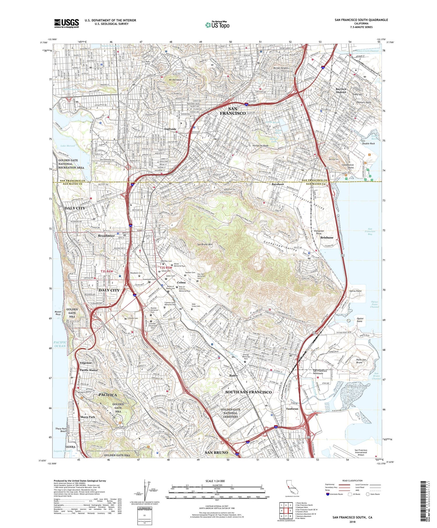 2021 topographic map quadrangle San Francisco South in the state of California. Scale: 1:24000. Based on the newly updated USGS 7.5' US Topo map series, this map is in the following counties: San Mateo, San Francisco. The map contains contour data, water features, and other items you are used to seeing on USGS maps, but also has updated roads and other features. This is the next generation of topographic maps. Printed on high-quality waterproof paper with UV fade-resistant inks.