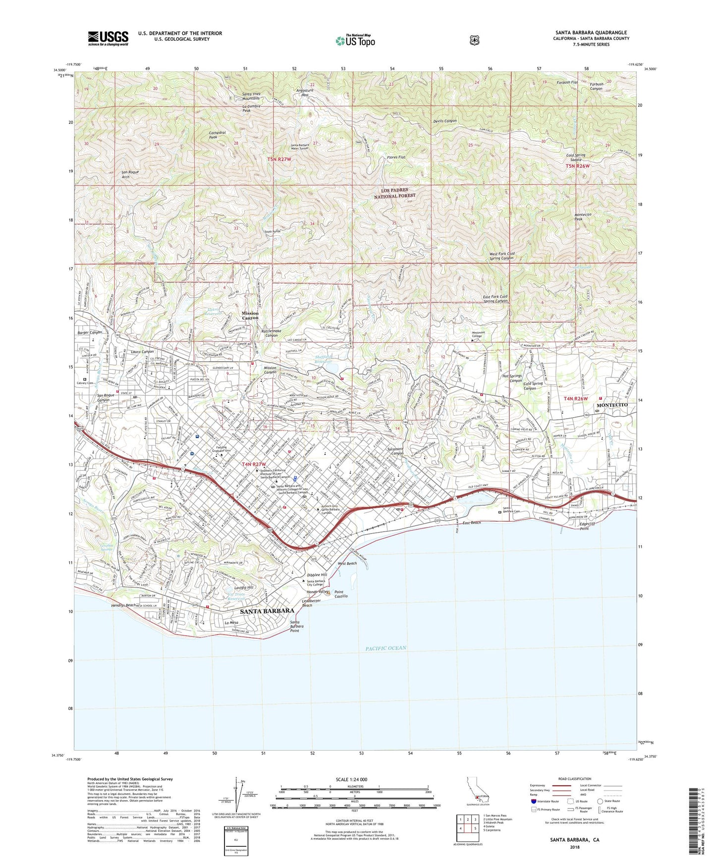 2022 topographic map quadrangle Santa Barbara in the state of California. Scale: 1:24000. Based on the newly updated USGS 7.5' US Topo map series, this map is in the following counties: Santa Barbara. The map contains contour data, water features, and other items you are used to seeing on USGS maps, but also has updated roads and other features. This is the next generation of topographic maps. Printed on high-quality waterproof paper with UV fade-resistant inks.