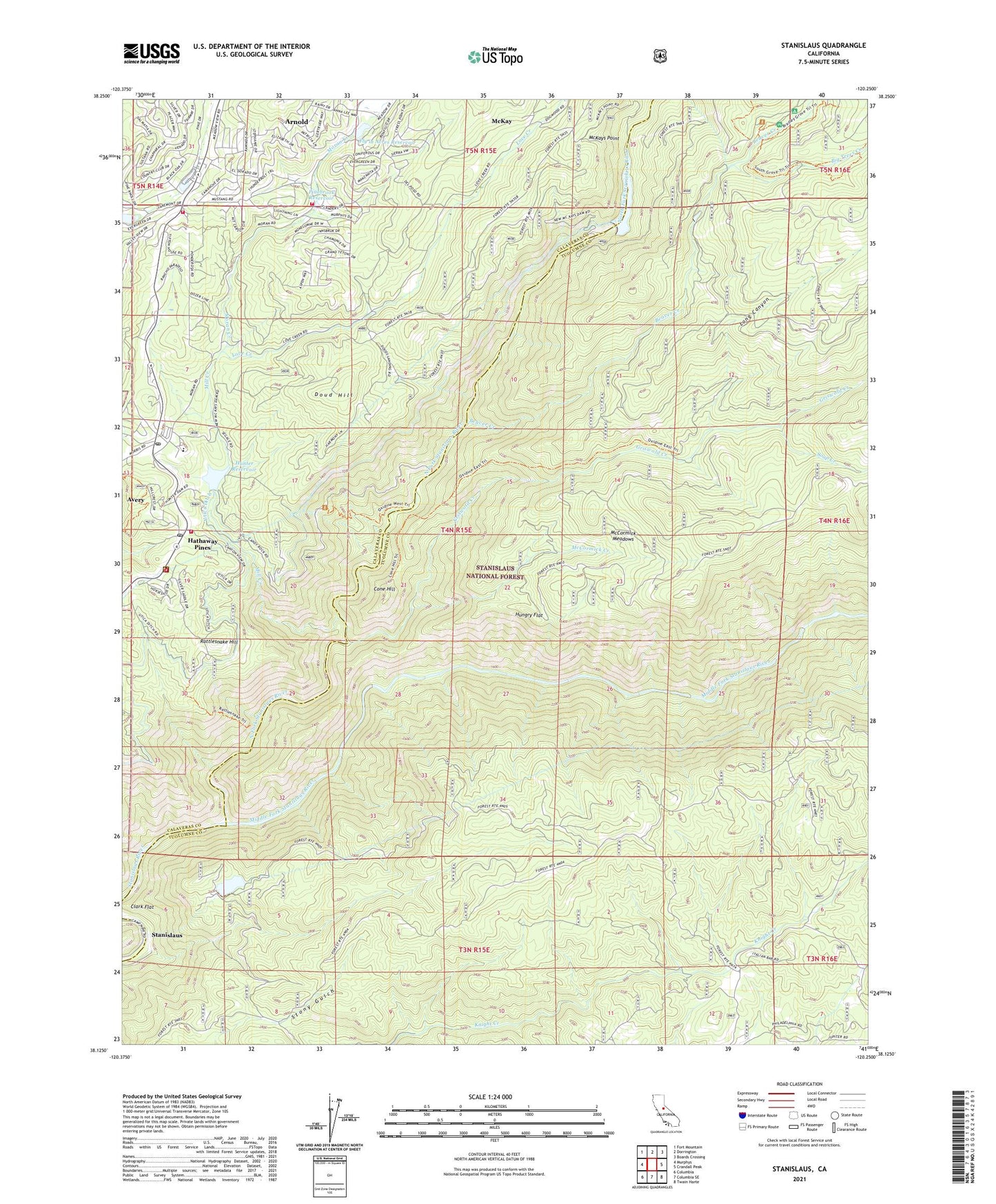 2021 topographic map quadrangle Stanislaus in the state of California. Scale: 1:24000. Based on the newly updated USGS 7.5' US Topo map series, this map is in the following counties: Tuolumne, Calaveras. The map contains contour data, water features, and other items you are used to seeing on USGS maps, but also has updated roads and other features. This is the next generation of topographic maps. Printed on high-quality waterproof paper with UV fade-resistant inks.