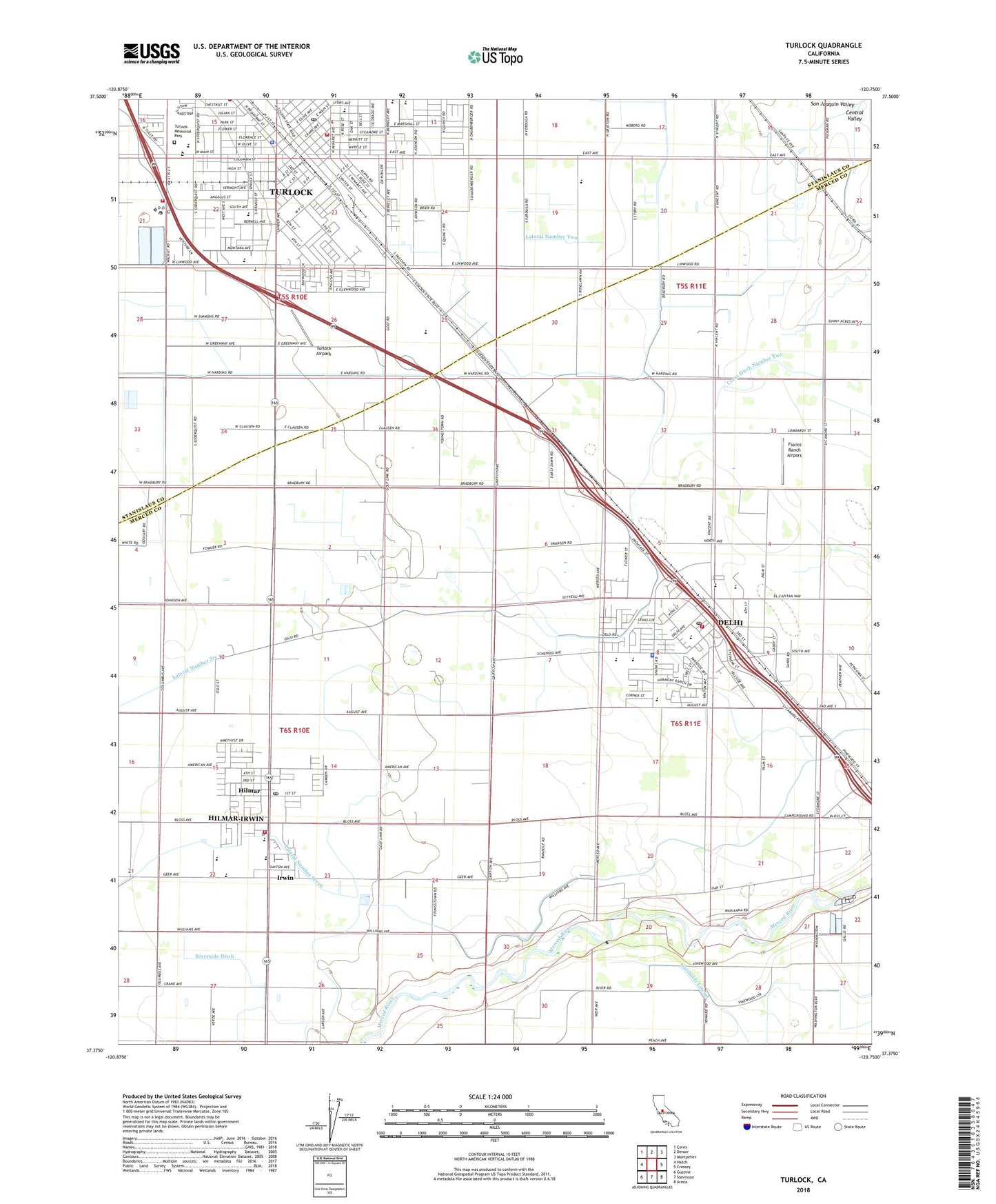 2021 topographic map quadrangle Turlock in the state of California. Scale: 1:24000. Based on the newly updated USGS 7.5' US Topo map series, this map is in the following counties: Merced, Stanislaus. The map contains contour data, water features, and other items you are used to seeing on USGS maps, but also has updated roads and other features. This is the next generation of topographic maps. Printed on high-quality waterproof paper with UV fade-resistant inks.