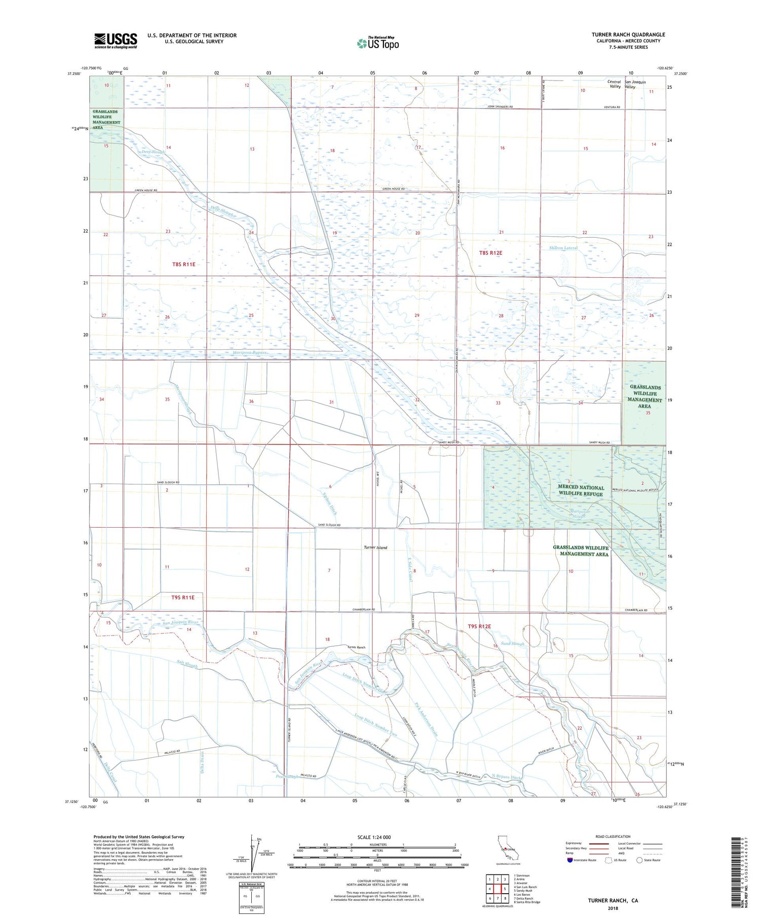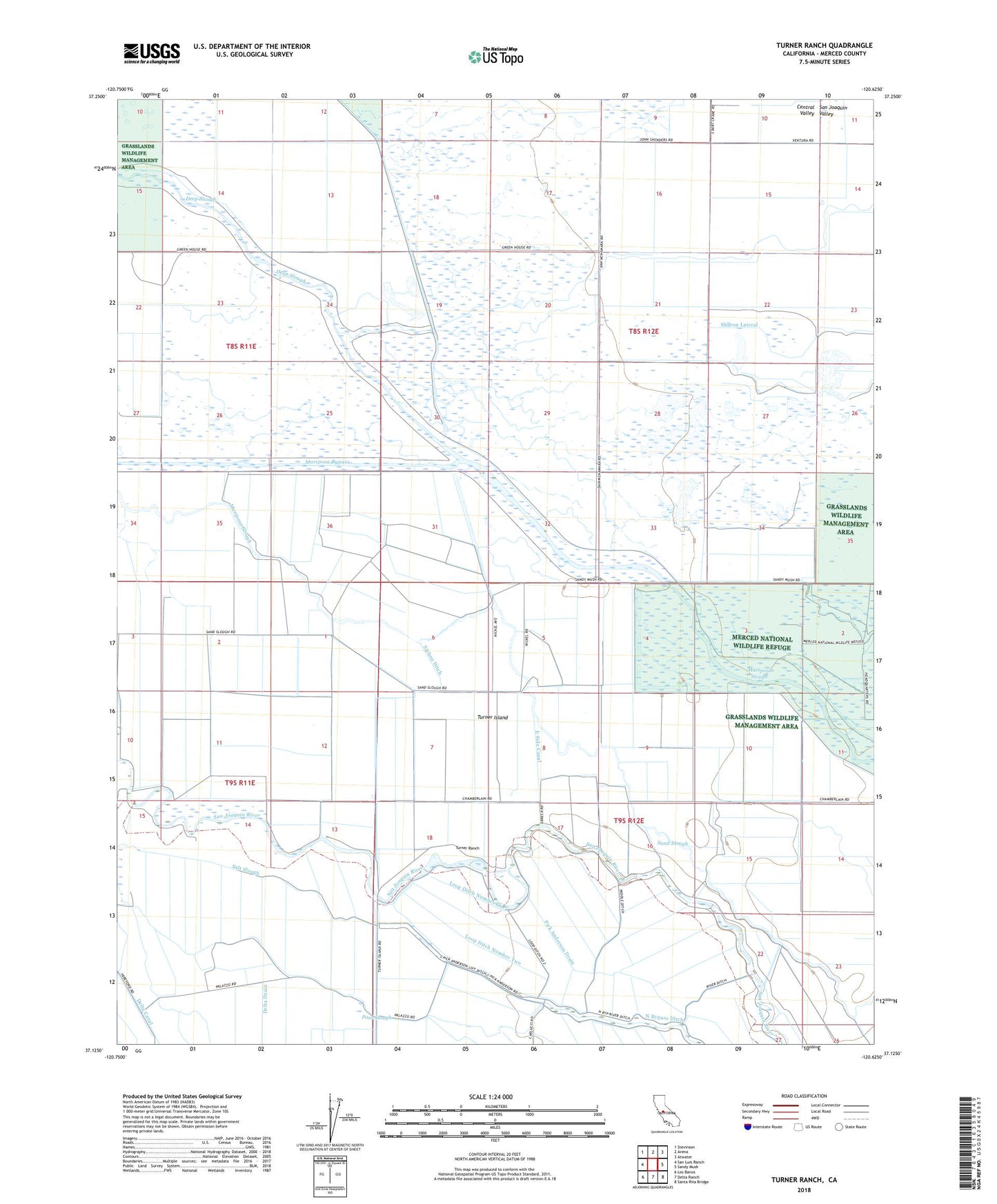 2021 topographic map quadrangle Turner Ranch in the state of California. Scale: 1:24000. Based on the newly updated USGS 7.5' US Topo map series, this map is in the following counties: Merced. The map contains contour data, water features, and other items you are used to seeing on USGS maps, but also has updated roads and other features. This is the next generation of topographic maps. Printed on high-quality waterproof paper with UV fade-resistant inks.