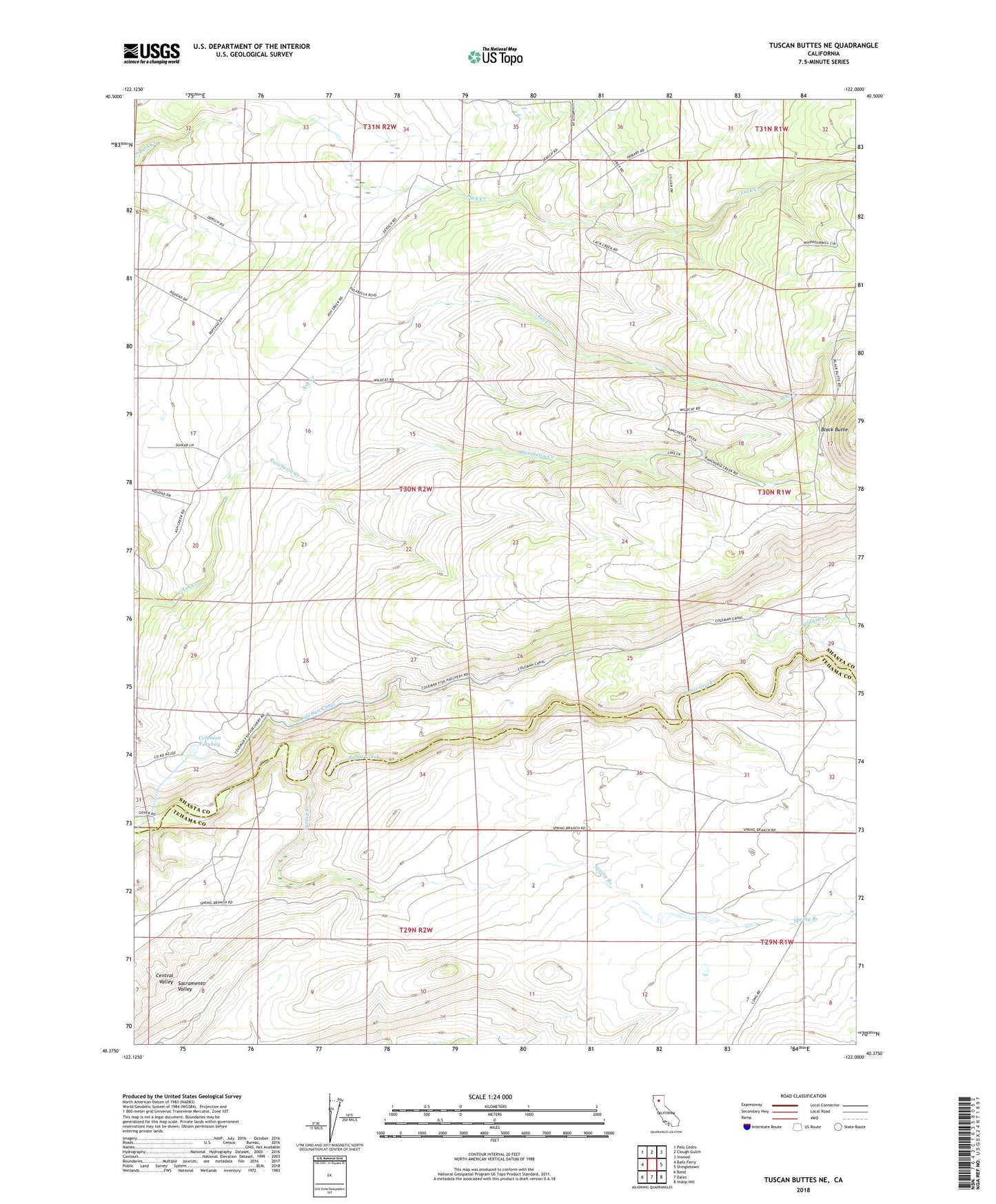 2022 topographic map quadrangle Tuscan Buttes NE in the state of California. Scale: 1:24000. Based on the newly updated USGS 7.5' US Topo map series, this map is in the following counties: Shasta, Tehama. The map contains contour data, water features, and other items you are used to seeing on USGS maps, but also has updated roads and other features. This is the next generation of topographic maps. Printed on high-quality waterproof paper with UV fade-resistant inks.