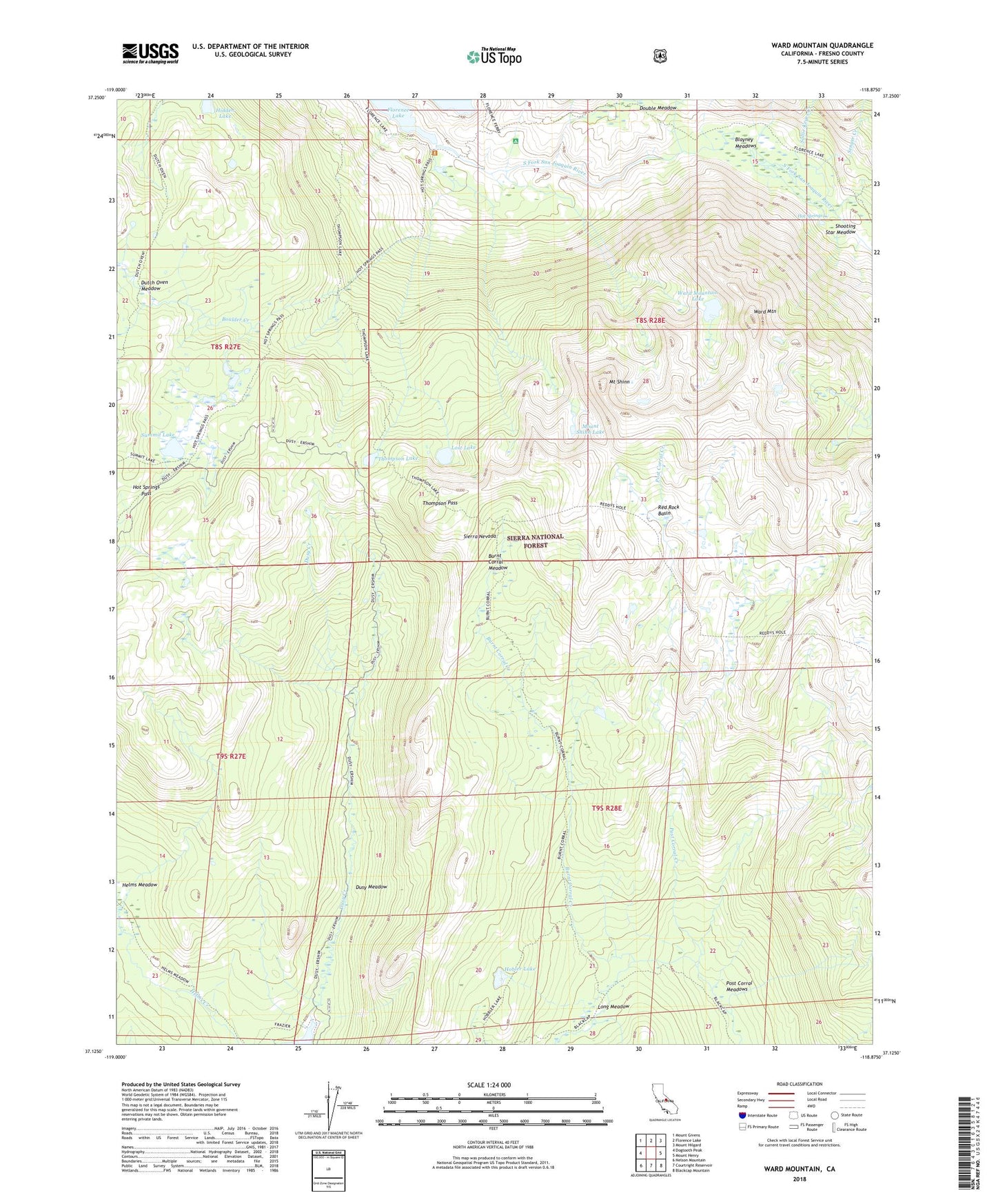 2021 topographic map quadrangle Ward Mountain in the state of California. Scale: 1:24000. Based on the newly updated USGS 7.5' US Topo map series, this map is in the following counties: Fresno. The map contains contour data, water features, and other items you are used to seeing on USGS maps, but also has updated roads and other features. This is the next generation of topographic maps. Printed on high-quality waterproof paper with UV fade-resistant inks.