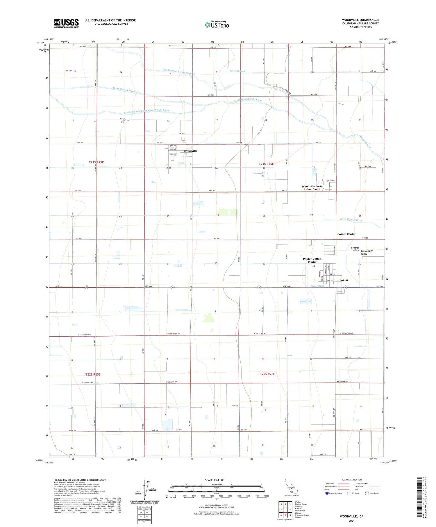2021 topographic map quadrangle Woodville in the state of California. Scale: 1:24000. Based on the newly updated USGS 7.5' US Topo map series, this map is in the following counties: Tulare. The map contains contour data, water features, and other items you are used to seeing on USGS maps, but also has updated roads and other features. This is the next generation of topographic maps. Printed on high-quality waterproof paper with UV fade-resistant inks.