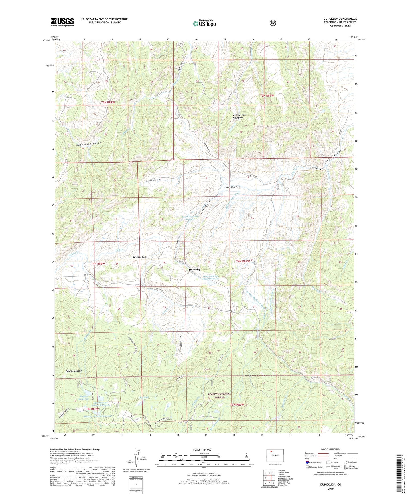 2022 topographic map quadrangle Dunckley in the state of Colorado. Scale: 1:24000. Based on the newly updated USGS 7.5' US Topo map series, this map is in the following counties: Routt. The map contains contour data, water features, and other items you are used to seeing on USGS maps, but also has updated roads and other features. This is the next generation of topographic maps. Printed on high-quality waterproof paper with UV fade-resistant inks.