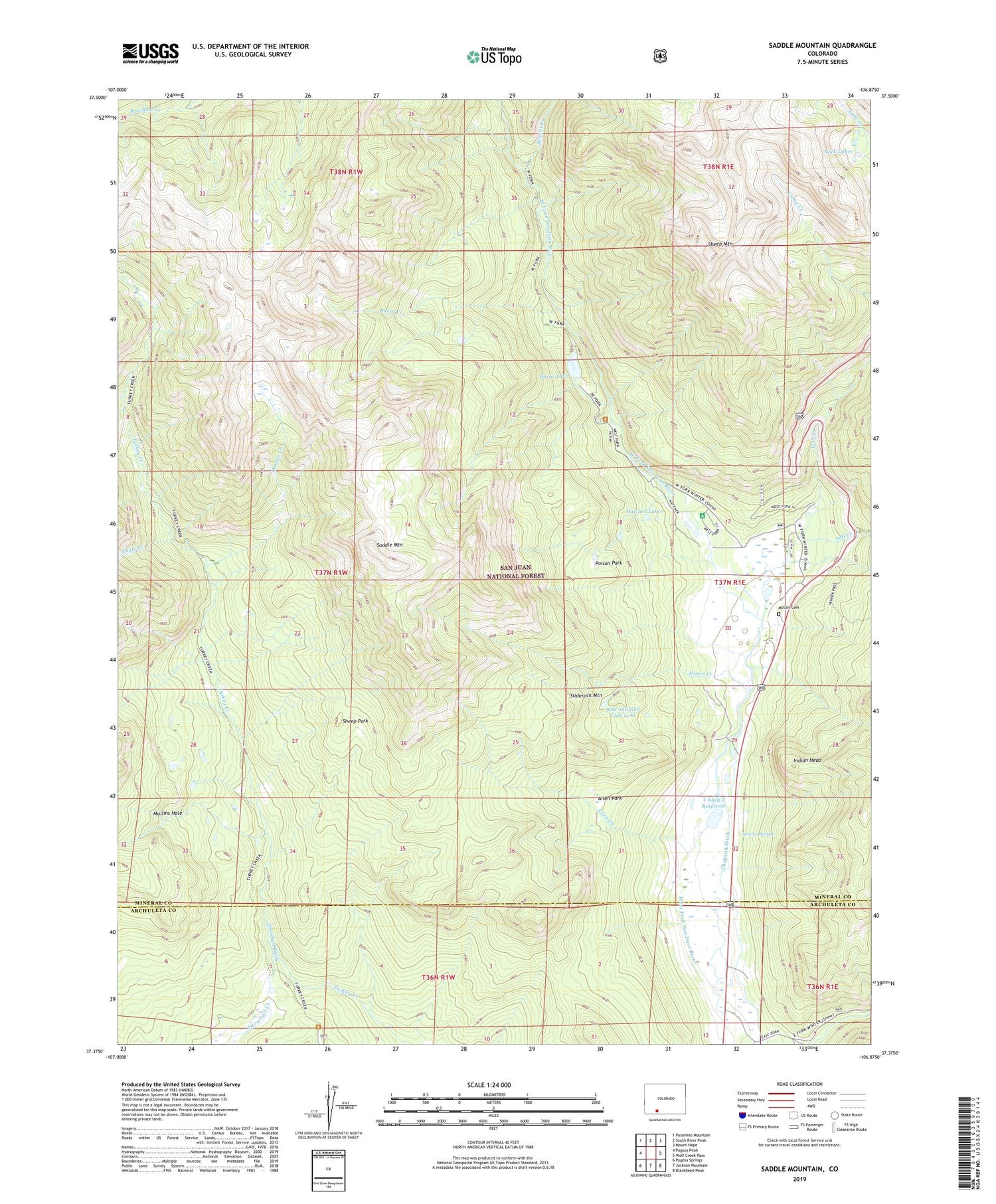 2022 topographic map quadrangle Saddle Mountain in the state of Colorado. Scale: 1:24000. Based on the newly updated USGS 7.5' US Topo map series, this map is in the following counties: Mineral, Archuleta. The map contains contour data, water features, and other items you are used to seeing on USGS maps, but also has updated roads and other features. This is the next generation of topographic maps. Printed on high-quality waterproof paper with UV fade-resistant inks.