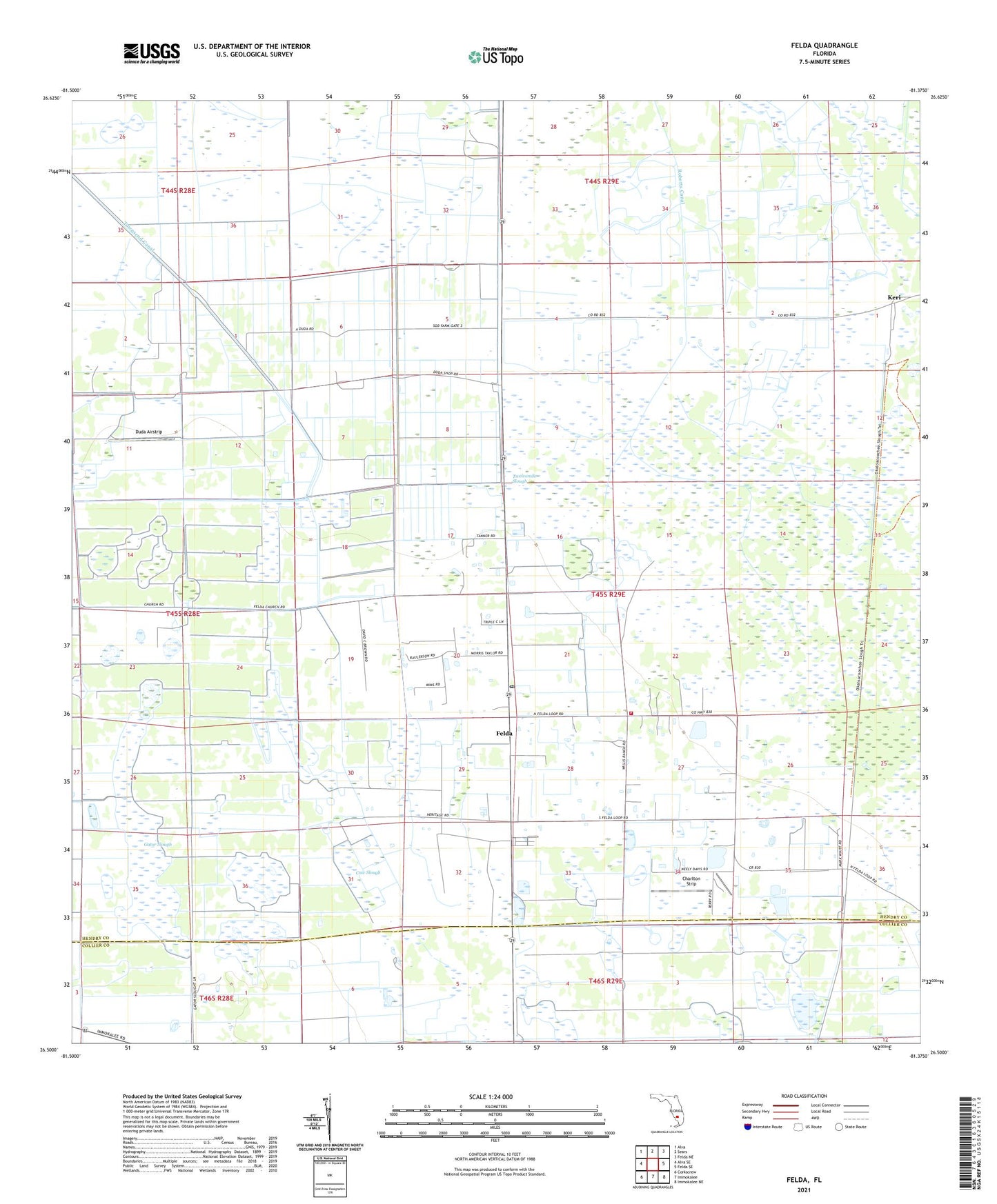 2024 topographic map quadrangle Felda in the state of Florida. Scale: 1:24000. Based on the newly updated USGS 7.5' US Topo map series, this map is in the following counties: Hendry, Collier. The map contains contour data, water features, and other items you are used to seeing on USGS maps, but also has updated roads and other features. This is the next generation of topographic maps. Printed on high-quality waterproof paper with UV fade-resistant inks.