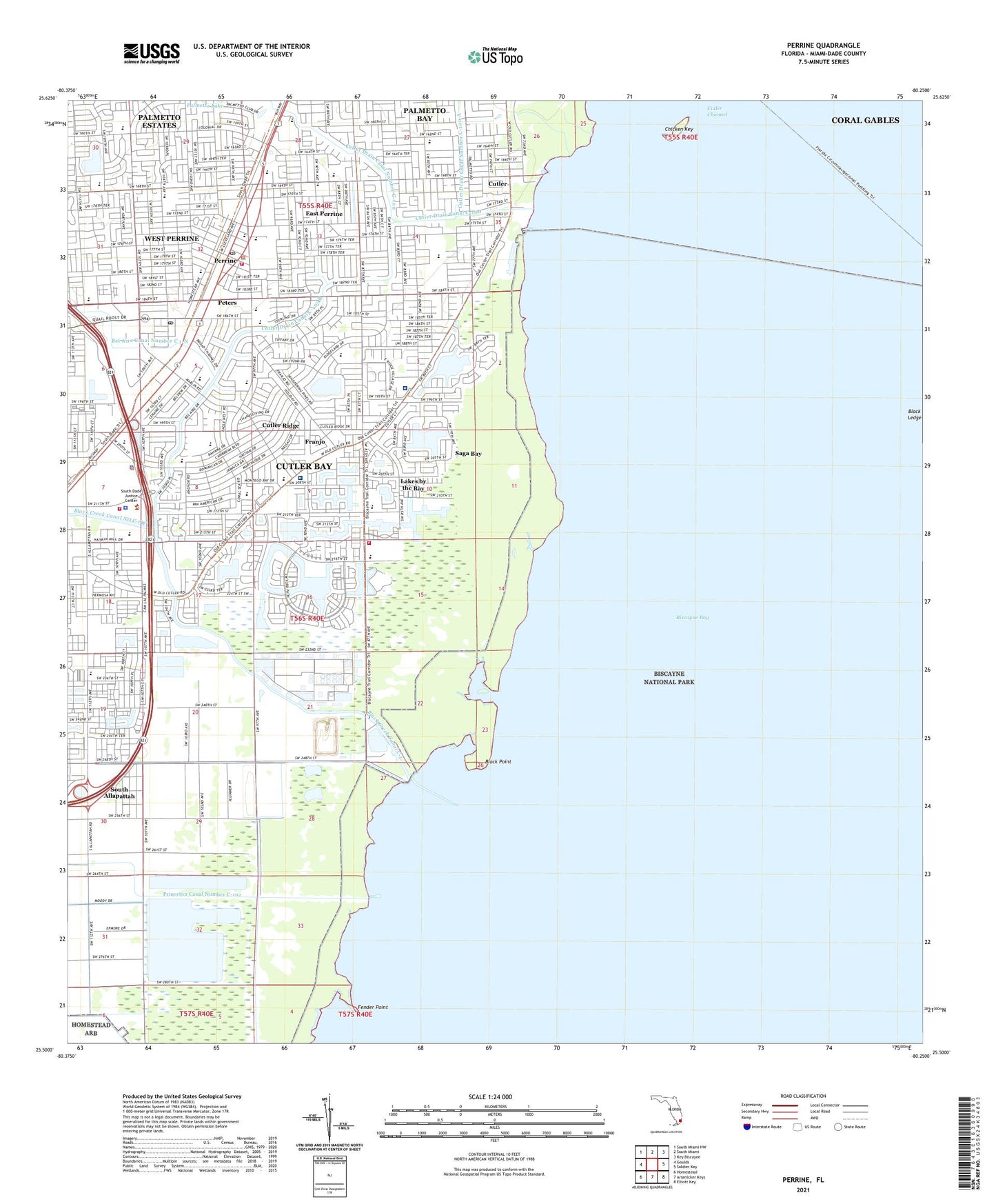 2024 topographic map quadrangle Perrine in the state of Florida. Scale: 1:24000. Based on the newly updated USGS 7.5' US Topo map series, this map is in the following counties: Miami-Dade. The map contains contour data, water features, and other items you are used to seeing on USGS maps, but also has updated roads and other features. This is the next generation of topographic maps. Printed on high-quality waterproof paper with UV fade-resistant inks.