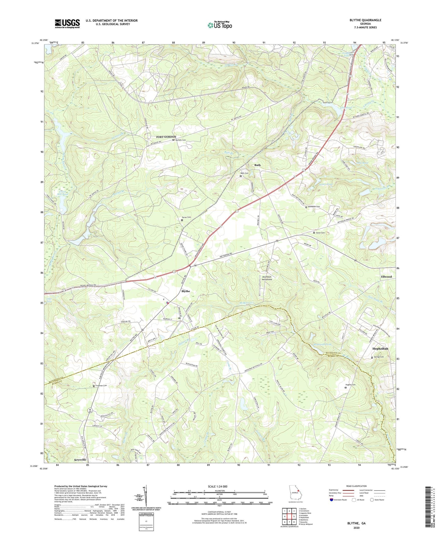 2024 topographic map quadrangle Blythe in the state of Georgia. Scale: 1:24000. Based on the newly updated USGS 7.5' US Topo map series, this map is in the following counties: Richmond, Burke, Jefferson. The map contains contour data, water features, and other items you are used to seeing on USGS maps, but also has updated roads and other features. This is the next generation of topographic maps. Printed on high-quality waterproof paper with UV fade-resistant inks.