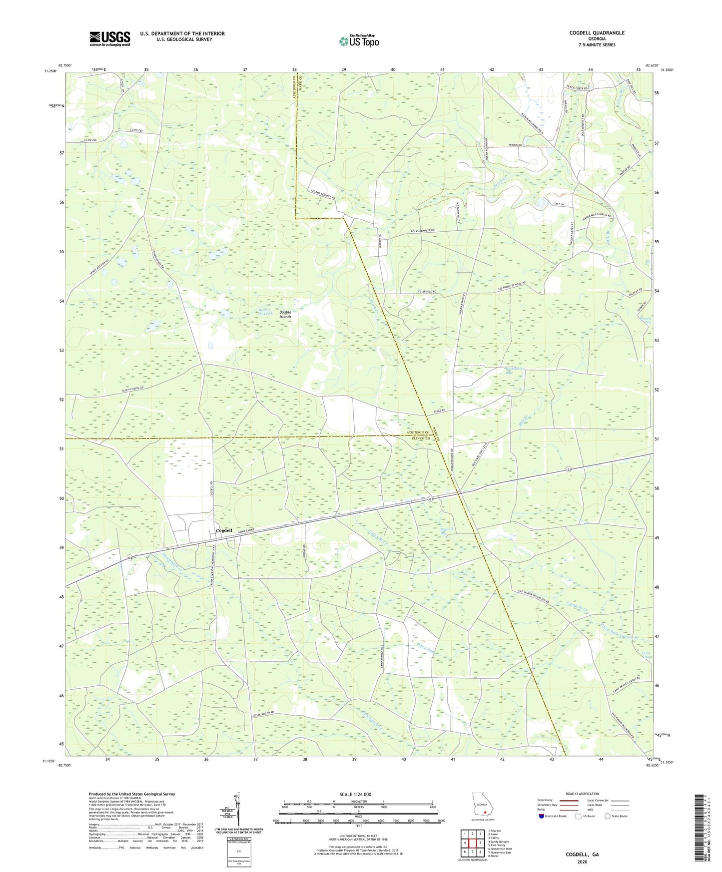 2024 topographic map quadrangle Cogdell in the state of Georgia. Scale: 1:24000. Based on the newly updated USGS 7.5' US Topo map series, this map is in the following counties: Ware, Clinch, Atkinson. The map contains contour data, water features, and other items you are used to seeing on USGS maps, but also has updated roads and other features. This is the next generation of topographic maps. Printed on high-quality waterproof paper with UV fade-resistant inks.
