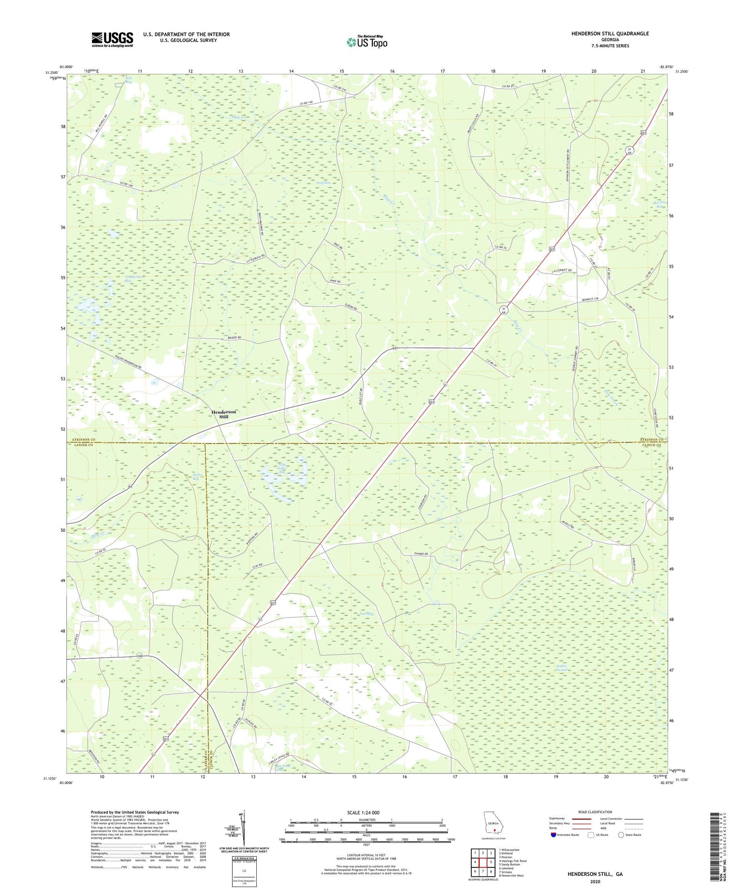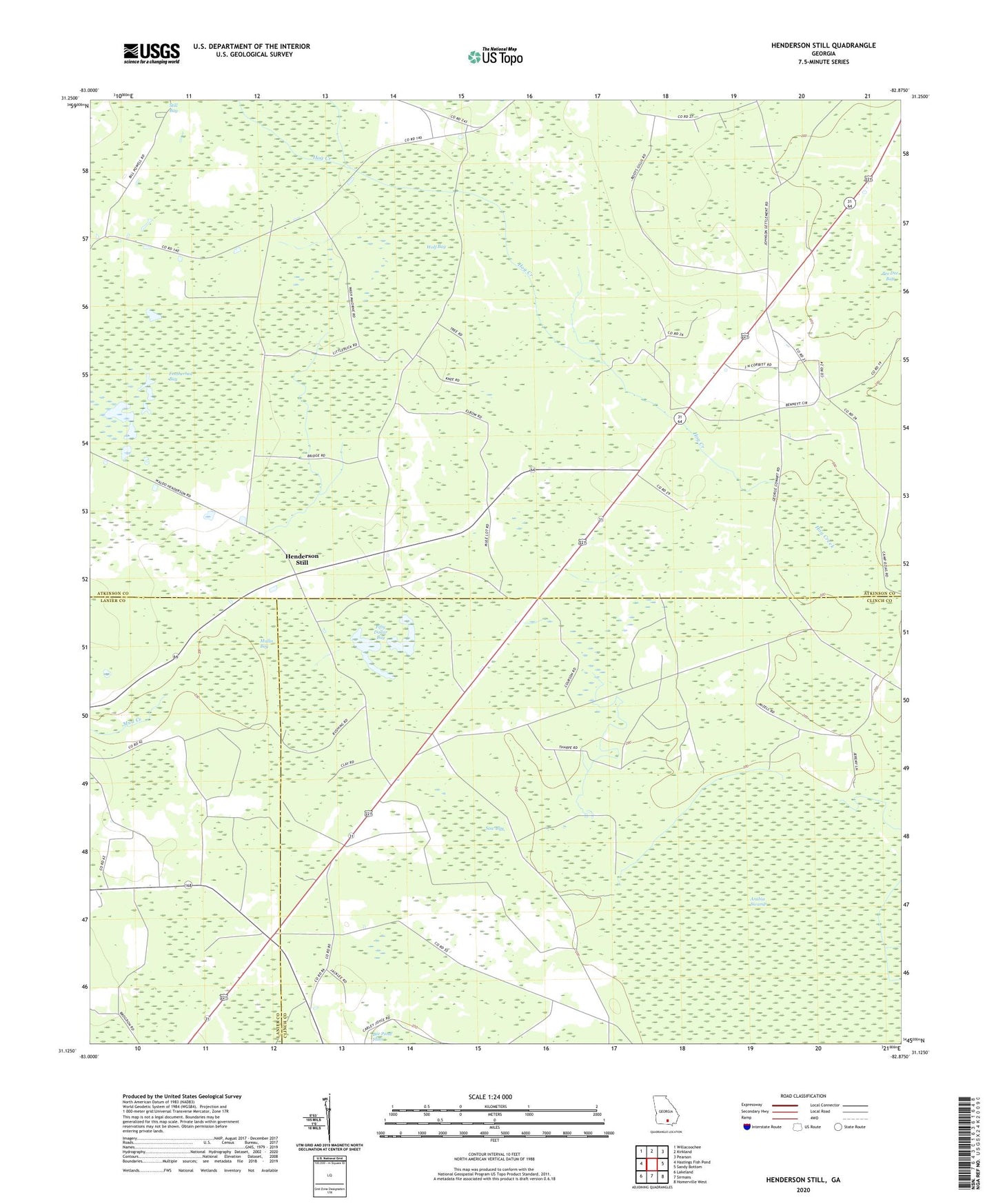 2024 topographic map quadrangle Henderson Still in the state of Georgia. Scale: 1:24000. Based on the newly updated USGS 7.5' US Topo map series, this map is in the following counties: Atkinson, Clinch, Lanier. The map contains contour data, water features, and other items you are used to seeing on USGS maps, but also has updated roads and other features. This is the next generation of topographic maps. Printed on high-quality waterproof paper with UV fade-resistant inks.