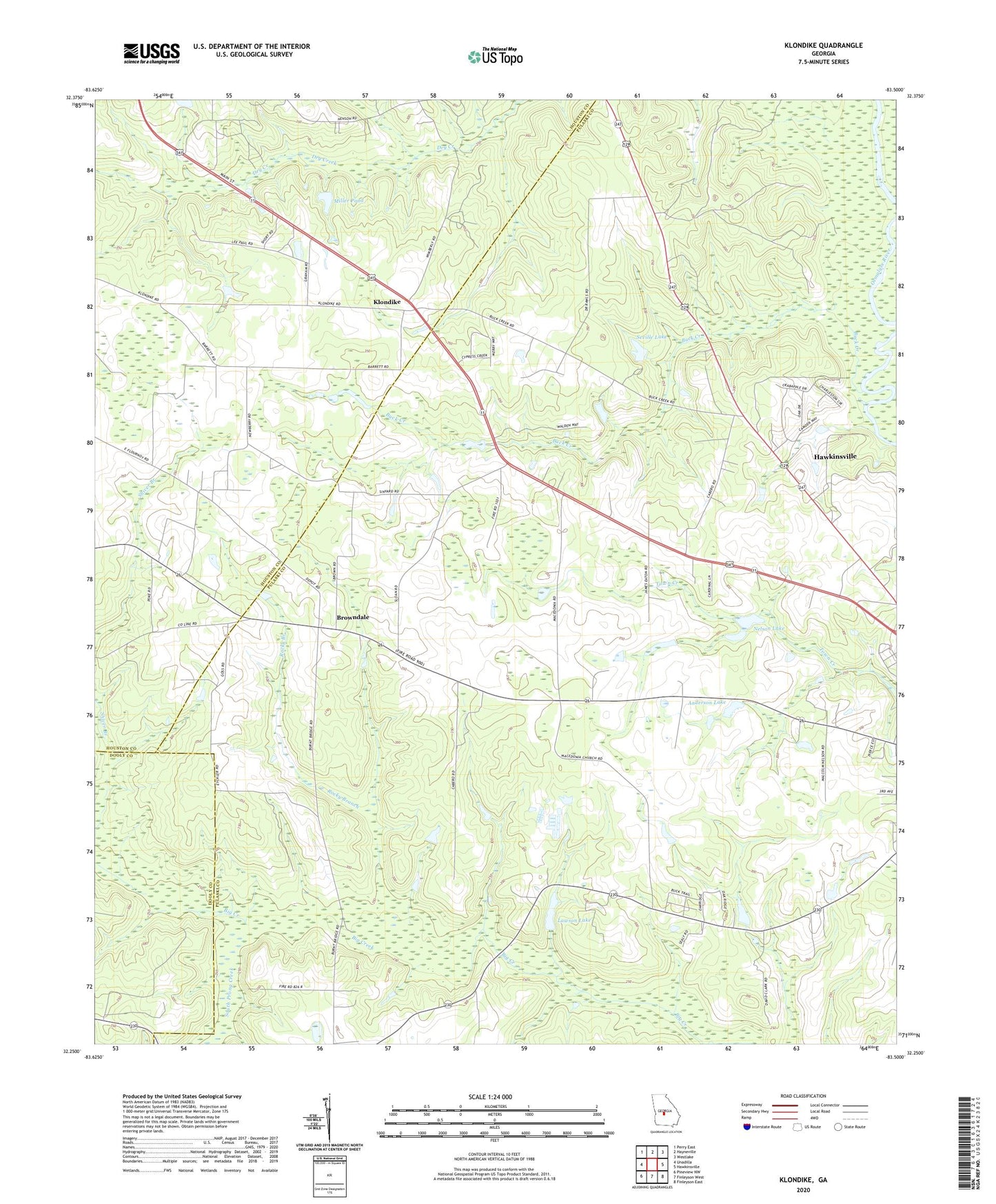 2024 topographic map quadrangle Klondike in the state of Georgia. Scale: 1:24000. Based on the newly updated USGS 7.5' US Topo map series, this map is in the following counties: Pulaski, Houston, Dooly. The map contains contour data, water features, and other items you are used to seeing on USGS maps, but also has updated roads and other features. This is the next generation of topographic maps. Printed on high-quality waterproof paper with UV fade-resistant inks.