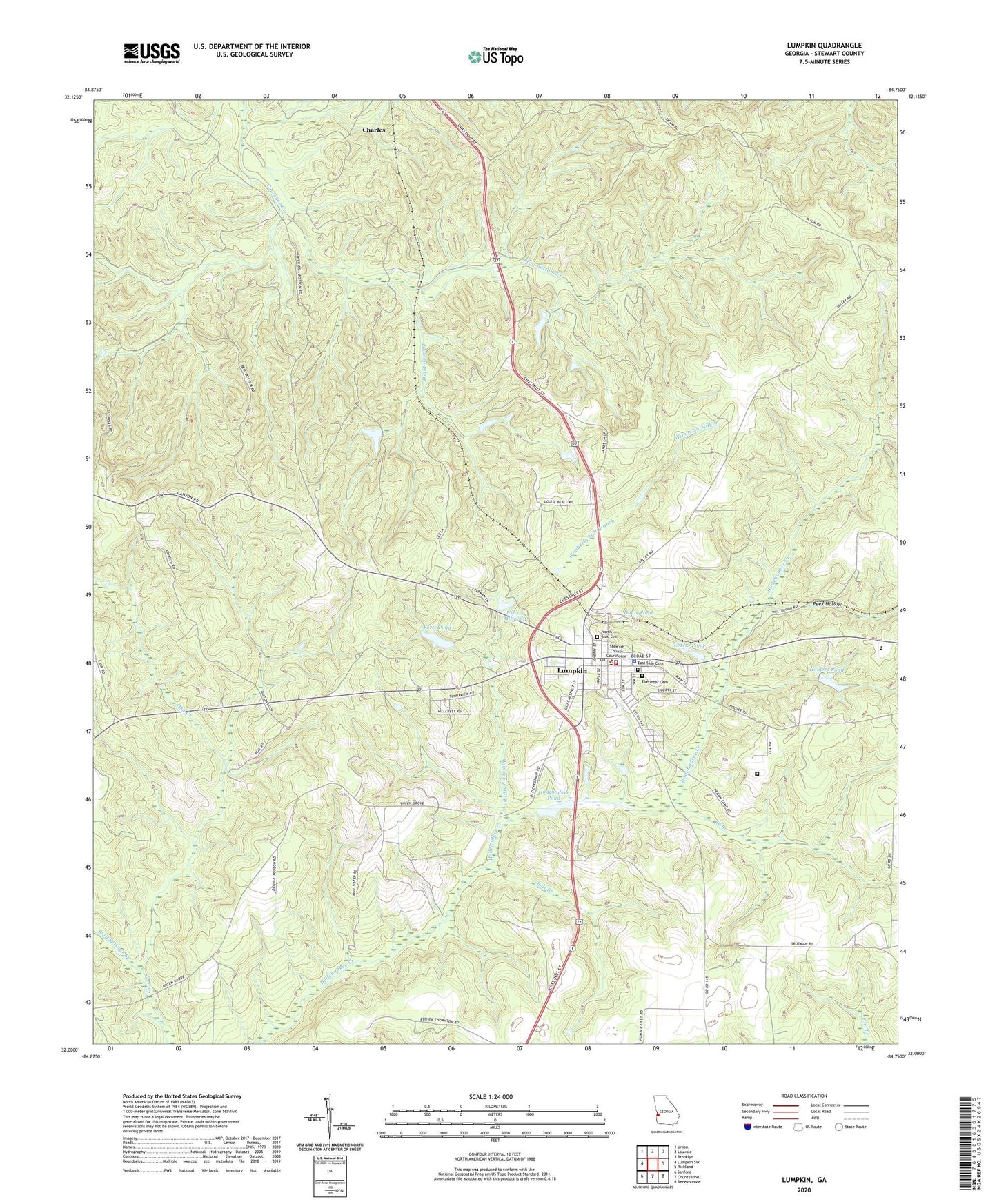 2024 topographic map quadrangle Lumpkin in the state of Georgia. Scale: 1:24000. Based on the newly updated USGS 7.5' US Topo map series, this map is in the following counties: Stewart. The map contains contour data, water features, and other items you are used to seeing on USGS maps, but also has updated roads and other features. This is the next generation of topographic maps. Printed on high-quality waterproof paper with UV fade-resistant inks.