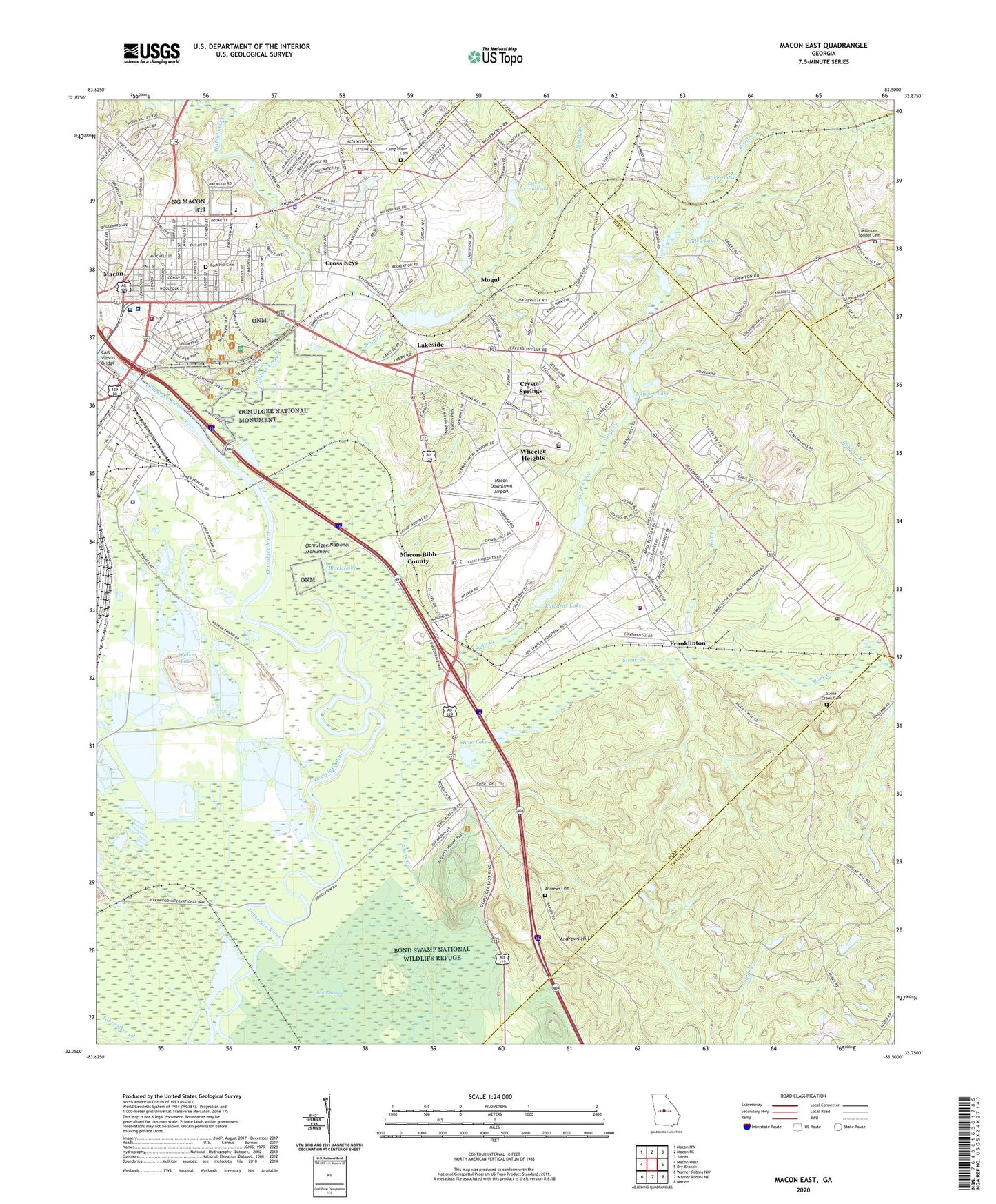 2024 topographic map quadrangle Macon East in the state of Georgia. Scale: 1:24000. Based on the newly updated USGS 7.5' US Topo map series, this map is in the following counties: Bibb, Twiggs, Jones. The map contains contour data, water features, and other items you are used to seeing on USGS maps, but also has updated roads and other features. This is the next generation of topographic maps. Printed on high-quality waterproof paper with UV fade-resistant inks.