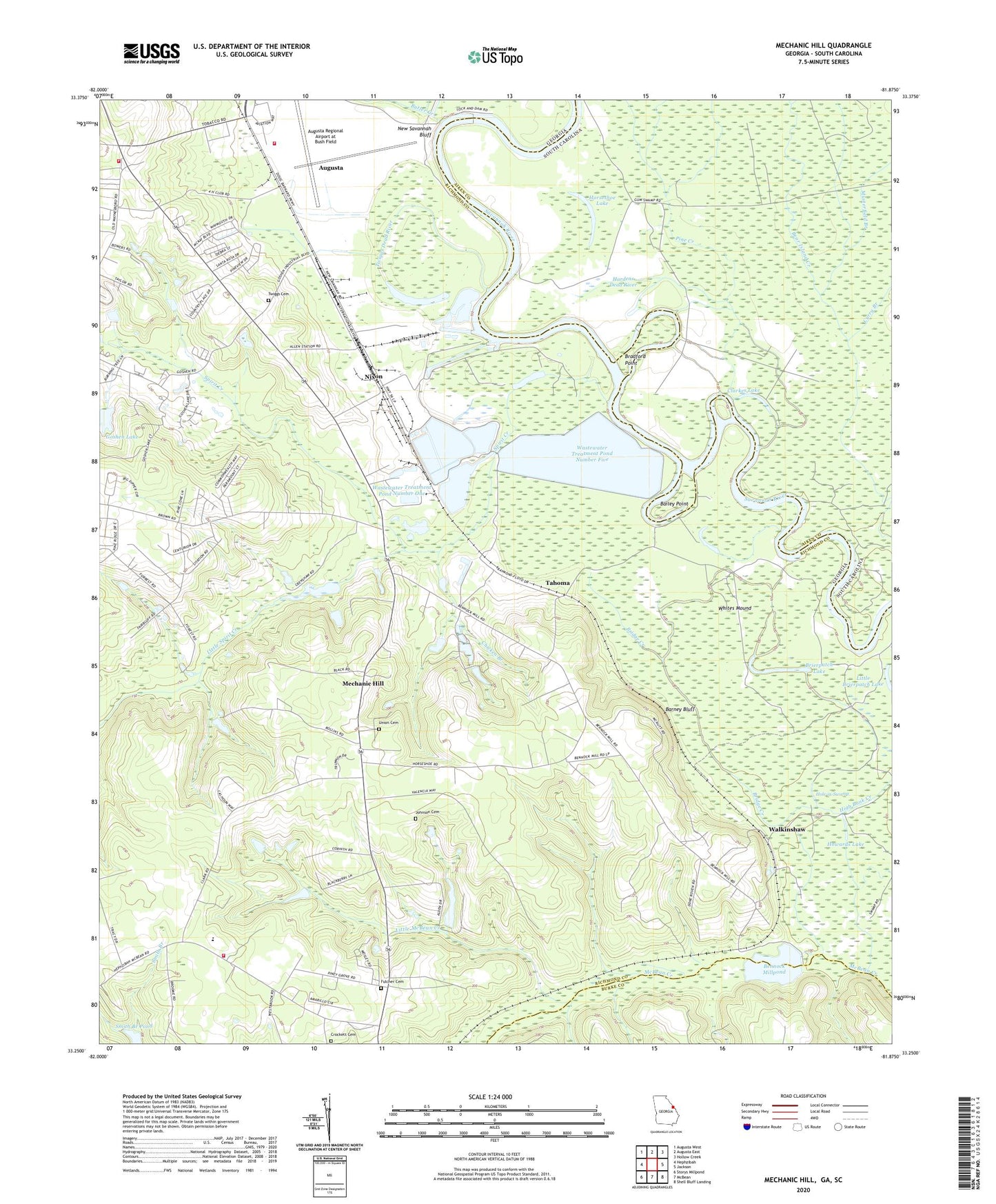 2024 topographic map quadrangle Mechanic Hill in the states of Georgia, South Carolina. Scale: 1:24000. Based on the newly updated USGS 7.5' US Topo map series, this map is in the following counties: Richmond, Aiken, Burke. The map contains contour data, water features, and other items you are used to seeing on USGS maps, but also has updated roads and other features. This is the next generation of topographic maps. Printed on high-quality waterproof paper with UV fade-resistant inks.