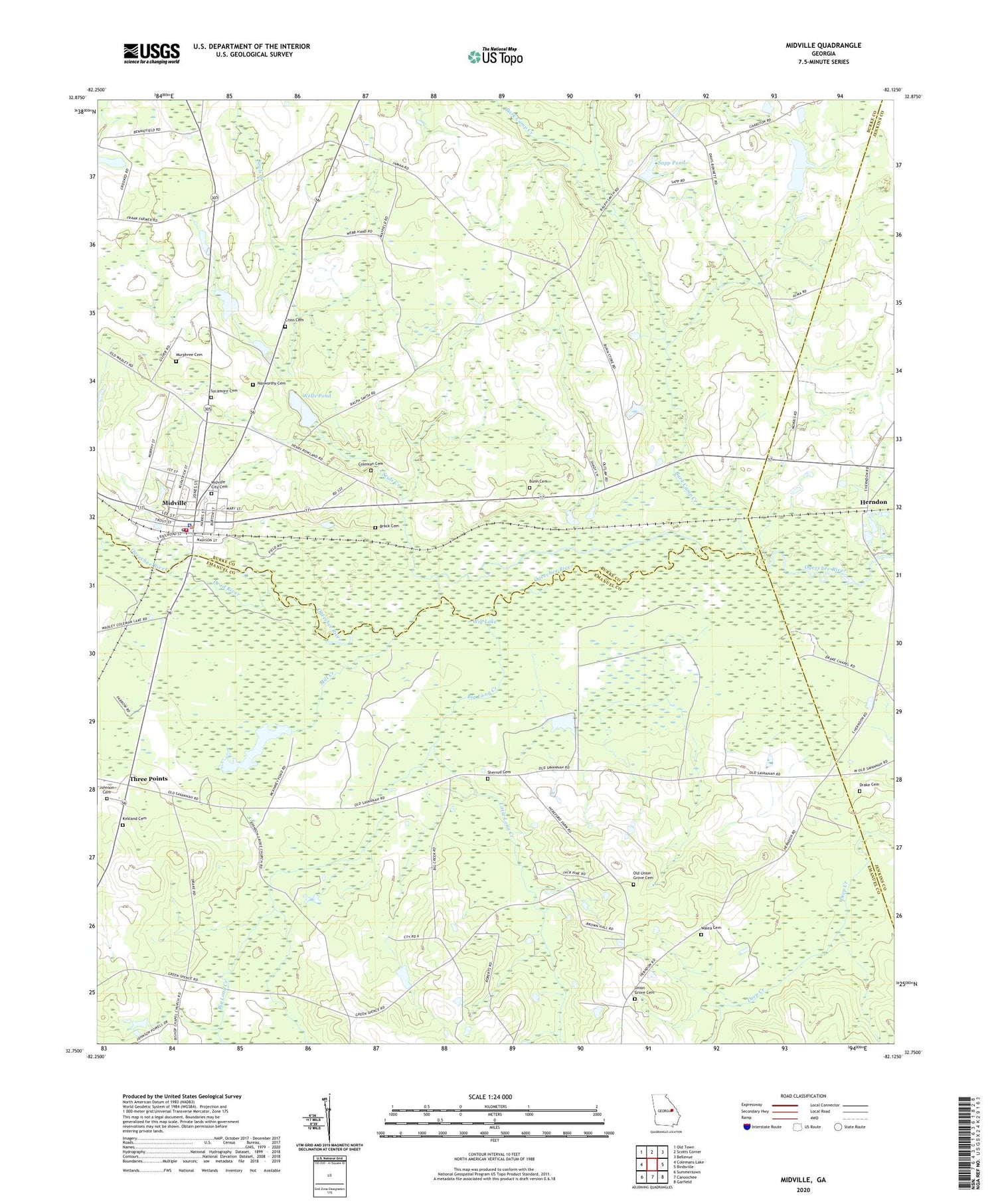 2024 topographic map quadrangle Midville in the state of Georgia. Scale: 1:24000. Based on the newly updated USGS 7.5' US Topo map series, this map is in the following counties: Burke, Emanuel, Jenkins. The map contains contour data, water features, and other items you are used to seeing on USGS maps, but also has updated roads and other features. This is the next generation of topographic maps. Printed on high-quality waterproof paper with UV fade-resistant inks.
