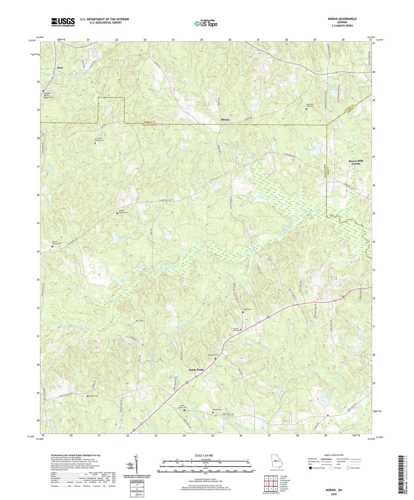 2024 topographic map quadrangle Moran in the state of Georgia. Scale: 1:24000. Based on the newly updated USGS 7.5' US Topo map series, this map is in the following counties: Crawford, Monroe, Bibb. The map contains contour data, water features, and other items you are used to seeing on USGS maps, but also has updated roads and other features. This is the next generation of topographic maps. Printed on high-quality waterproof paper with UV fade-resistant inks.