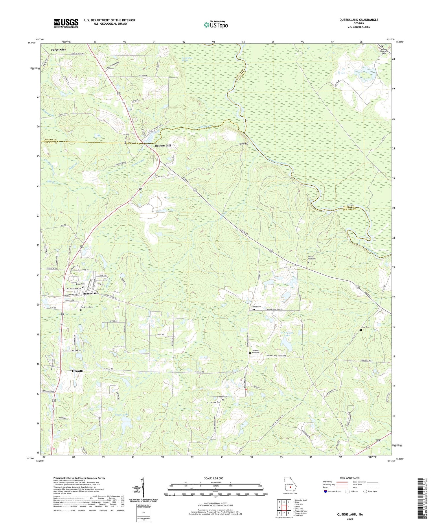 2024 topographic map quadrangle Queensland in the state of Georgia. Scale: 1:24000. Based on the newly updated USGS 7.5' US Topo map series, this map is in the following counties: Ben Hill, Telfair, Wilcox. The map contains contour data, water features, and other items you are used to seeing on USGS maps, but also has updated roads and other features. This is the next generation of topographic maps. Printed on high-quality waterproof paper with UV fade-resistant inks.