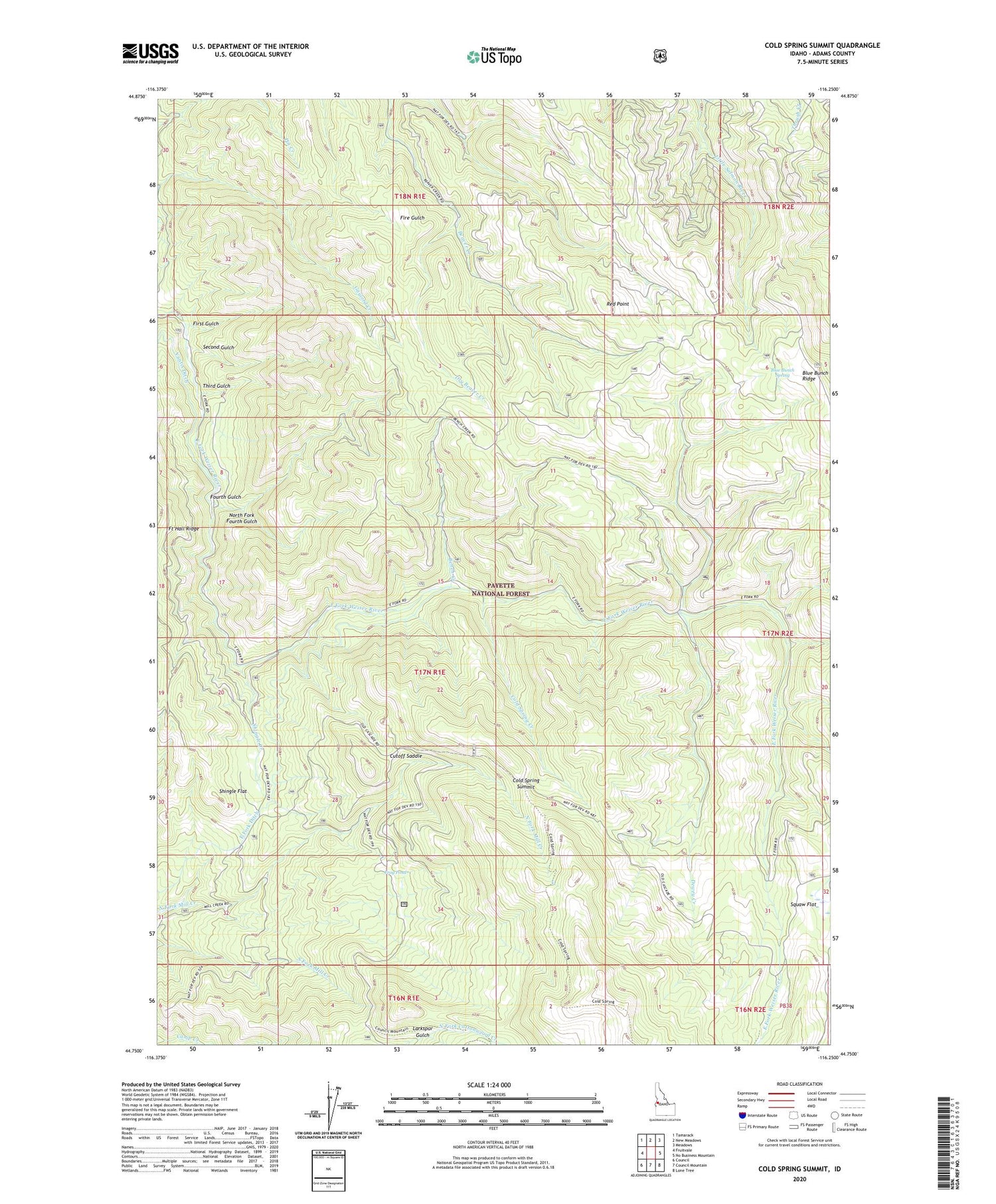 2024 topographic map quadrangle Cold Spring Summit in the state of Idaho. Scale: 1:24000. Based on the newly updated USGS 7.5' US Topo map series, this map is in the following counties: Adams. The map contains contour data, water features, and other items you are used to seeing on USGS maps, but also has updated roads and other features. This is the next generation of topographic maps. Printed on high-quality waterproof paper with UV fade-resistant inks.