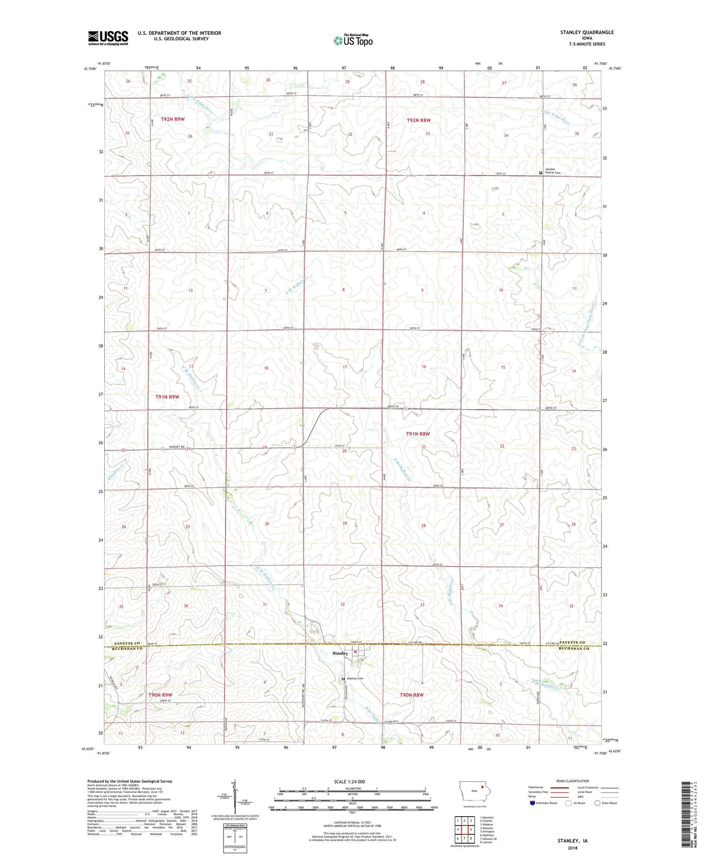 2022 topographic map quadrangle Stanley in the state of Iowa. Scale: 1:24000. Based on the newly updated USGS 7.5' US Topo map series, this map is in the following counties: Fayette, Buchanan. The map contains contour data, water features, and other items you are used to seeing on USGS maps, but also has updated roads and other features. This is the next generation of topographic maps. Printed on high-quality waterproof paper with UV fade-resistant inks.