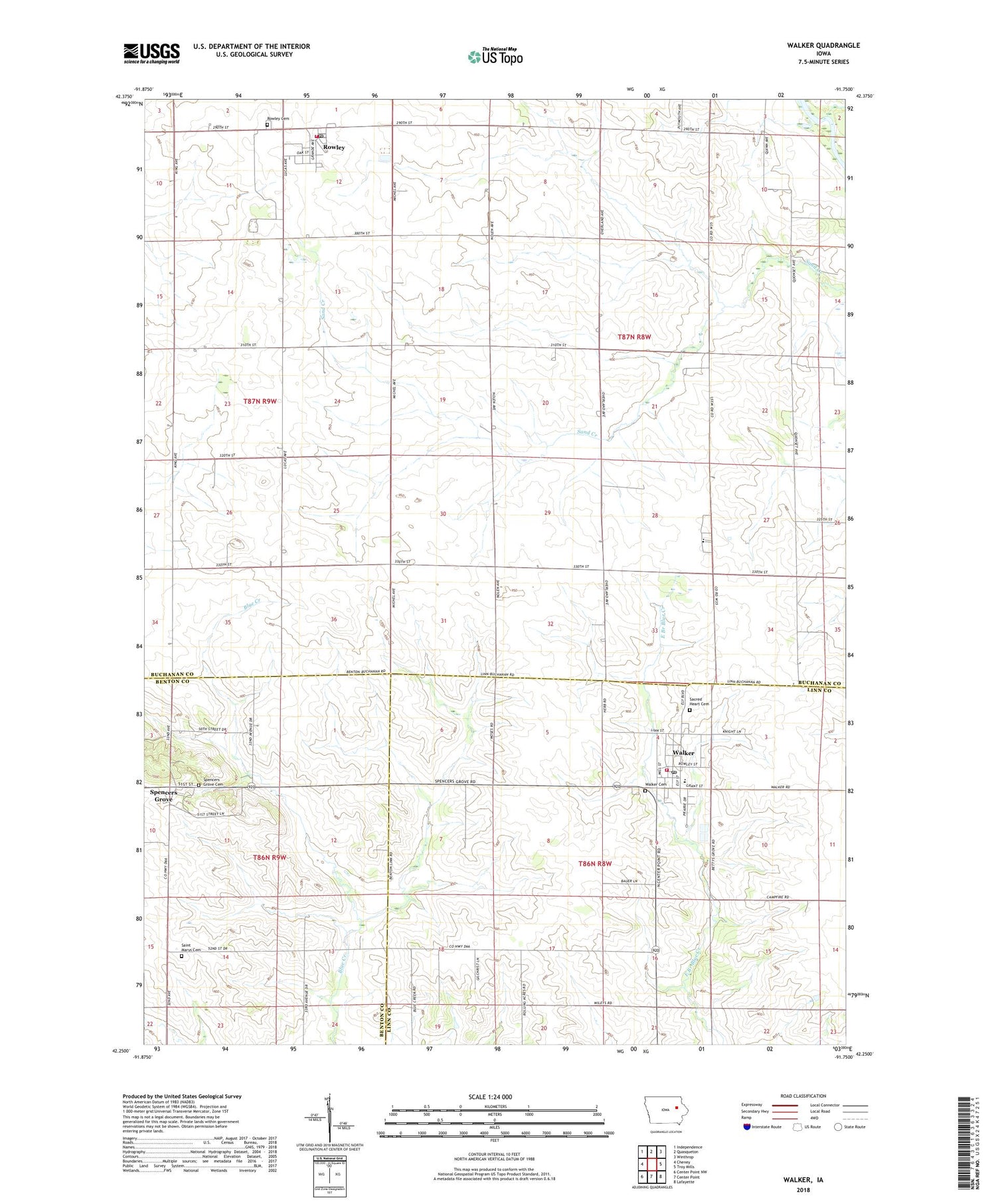 2022 topographic map quadrangle Walker in the state of Iowa. Scale: 1:24000. Based on the newly updated USGS 7.5' US Topo map series, this map is in the following counties: Buchanan, Linn, Benton. The map contains contour data, water features, and other items you are used to seeing on USGS maps, but also has updated roads and other features. This is the next generation of topographic maps. Printed on high-quality waterproof paper with UV fade-resistant inks.